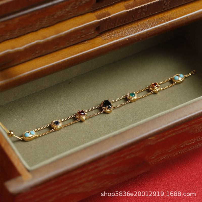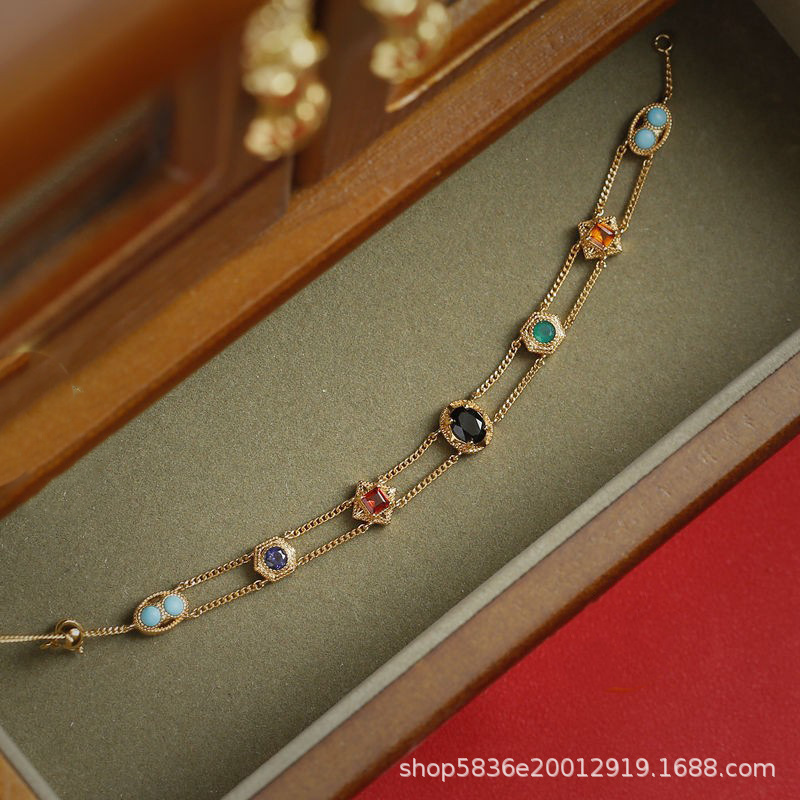 彩虹七彩色鋯石雙層手鏈鍍金西洋風復古小衆氣質中古手環精緻手鐲