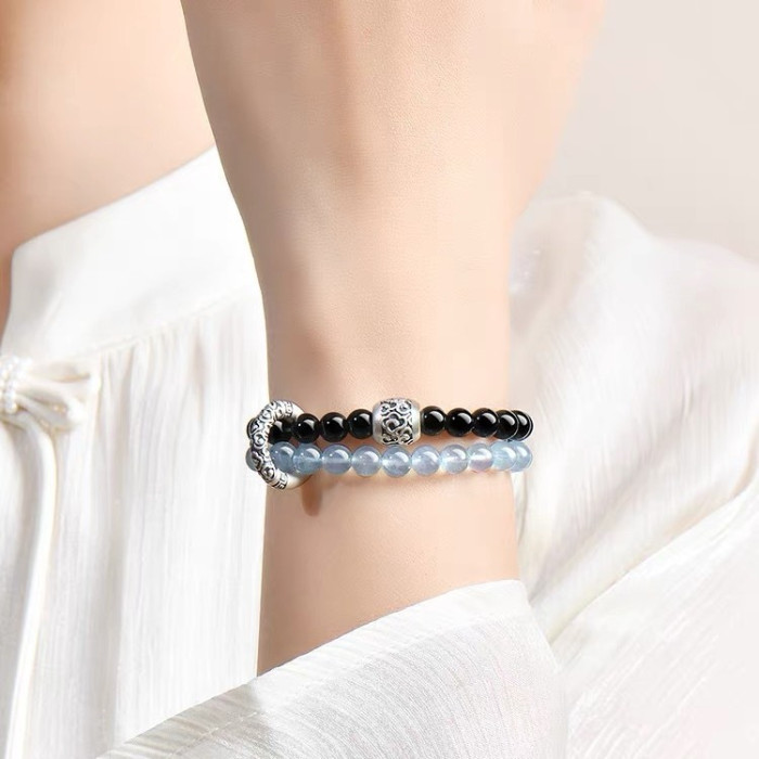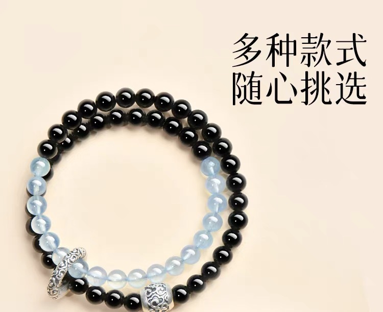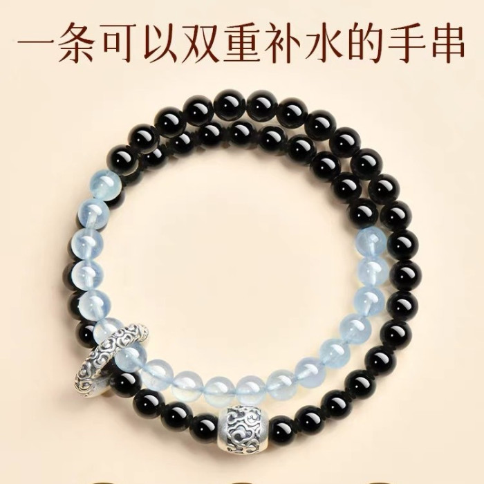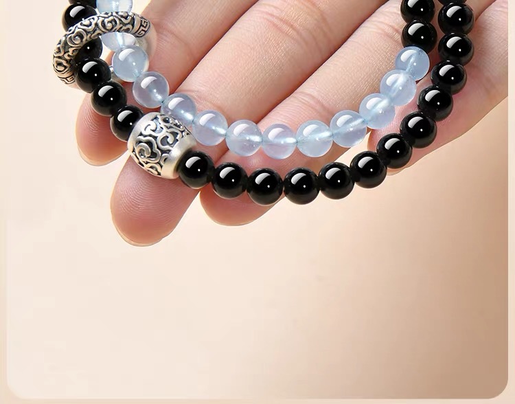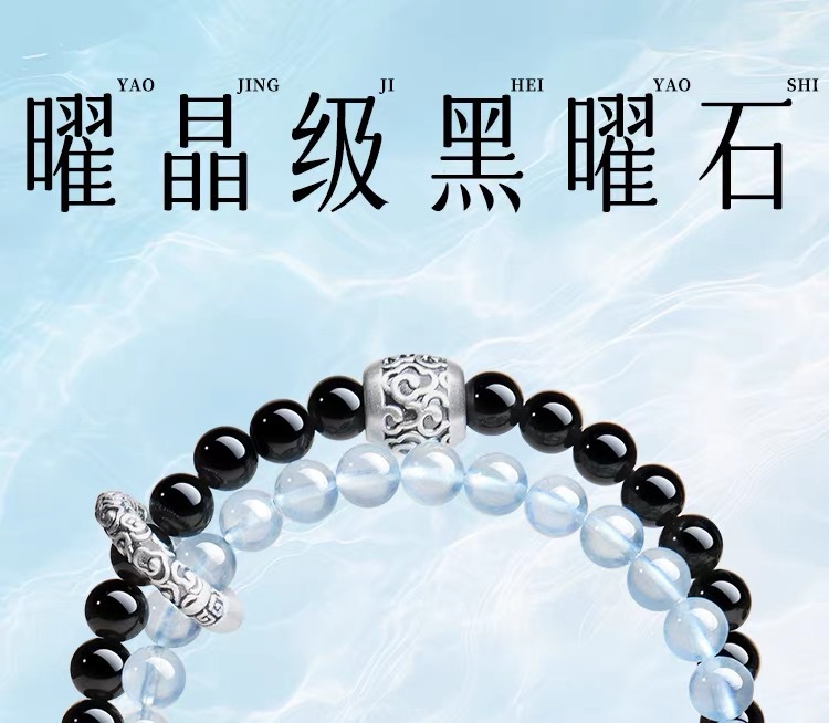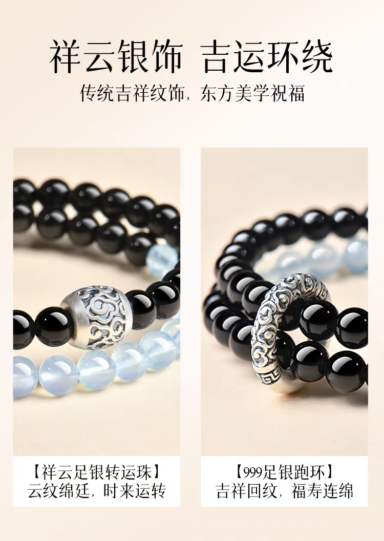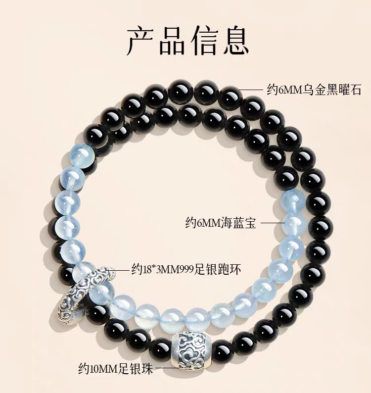 2025新品天然海藍寶黑曜石雙圈手鏈999足銀祥雲黃虎 手串男女禮物