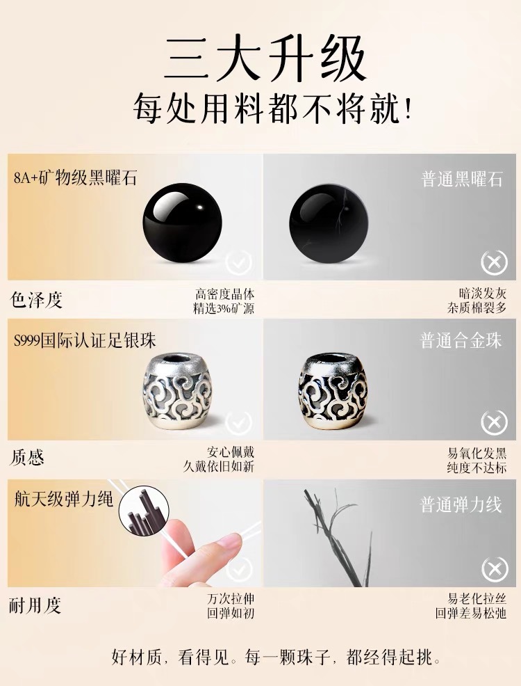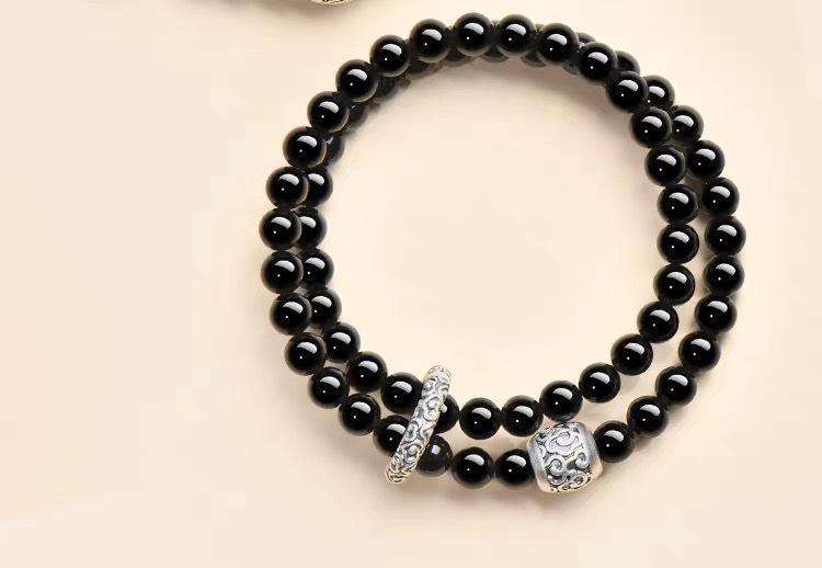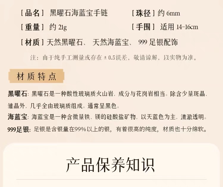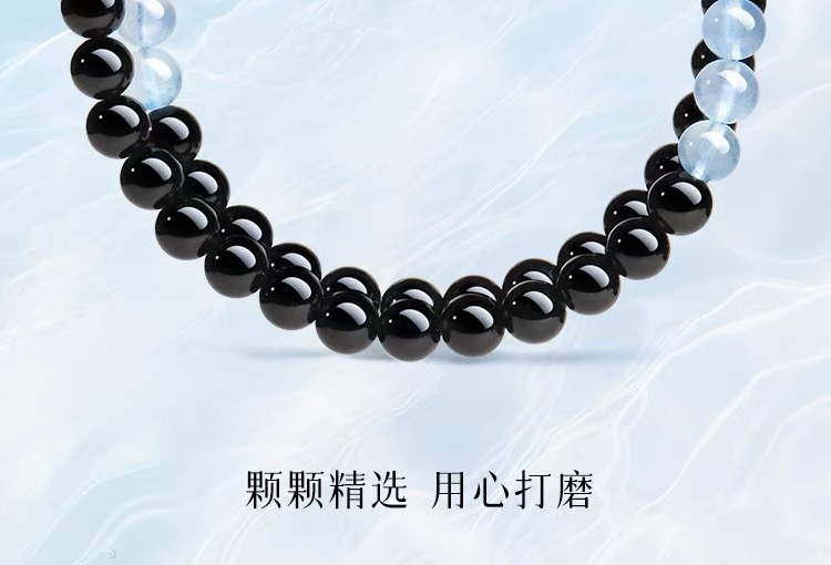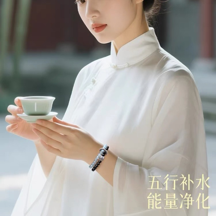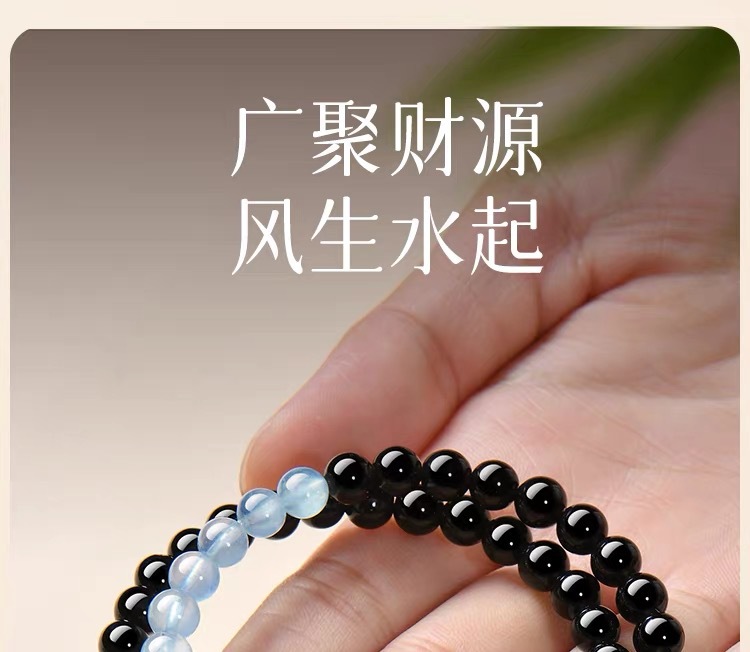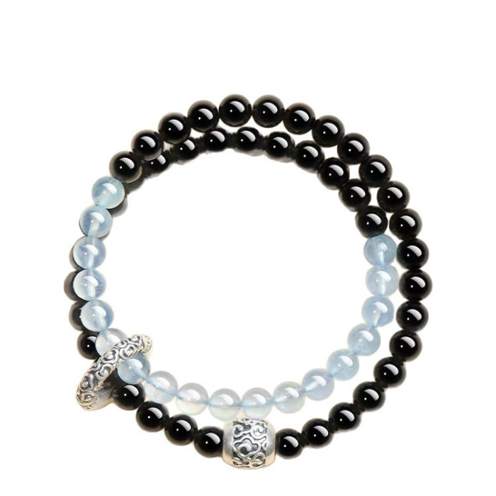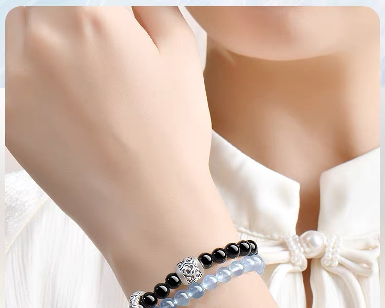 2025新品天然海藍寶黑曜石雙圈手鏈999足銀祥雲黃虎 手串男女禮物