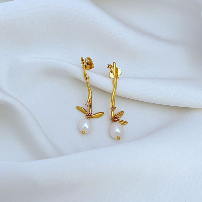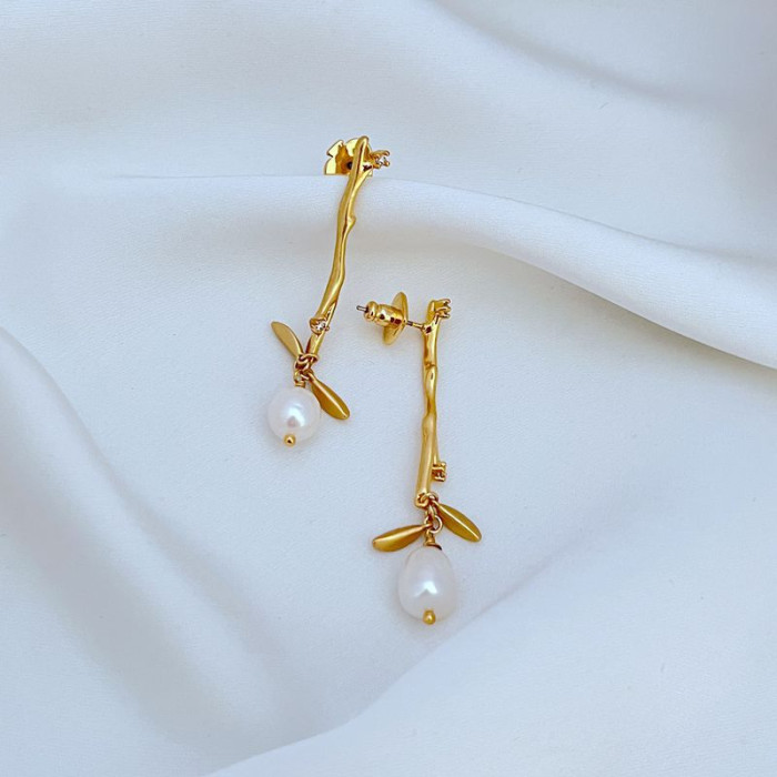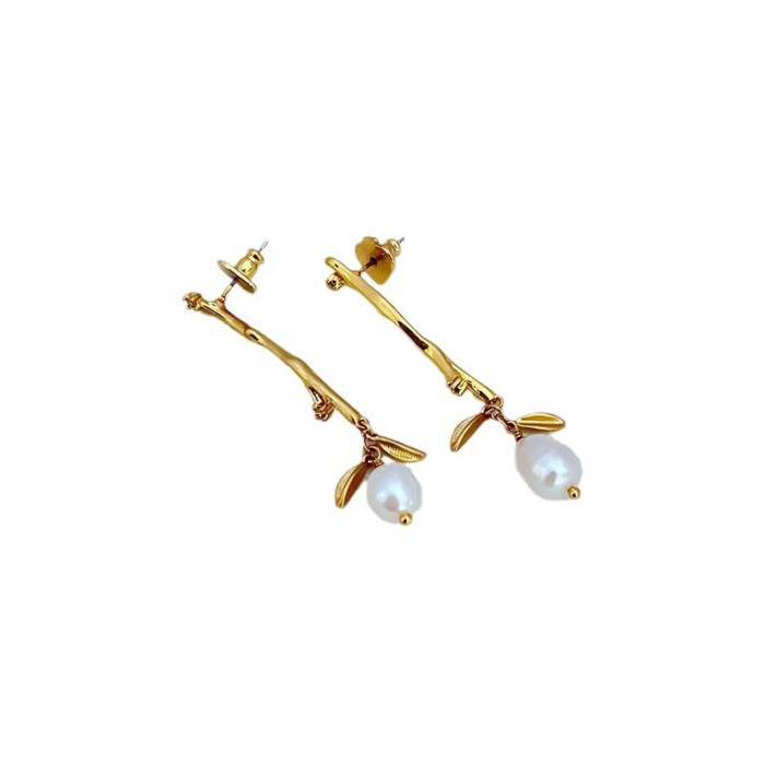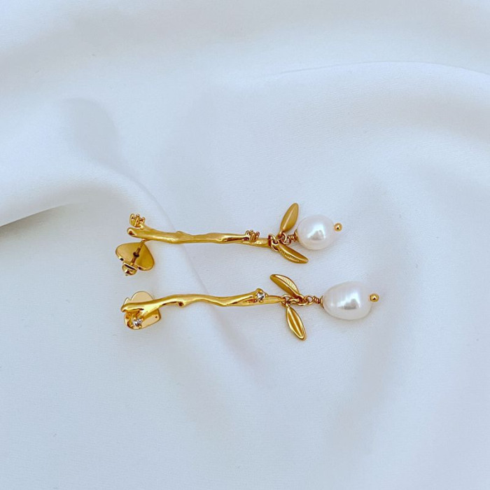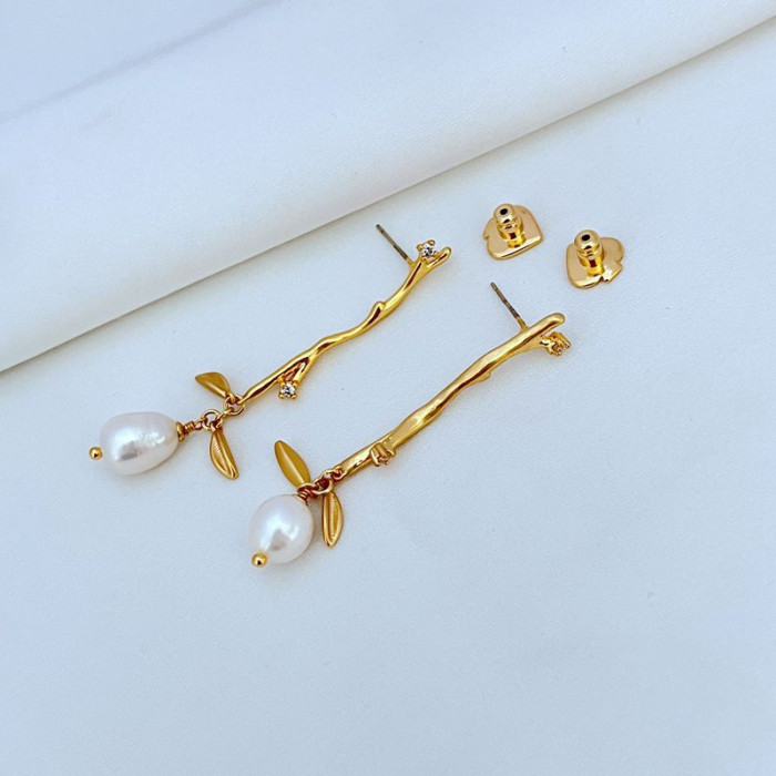 簡約鍍18K金啞光樹枝耳墜天然淡水珍珠耳釘KS925銀針歐美飾品