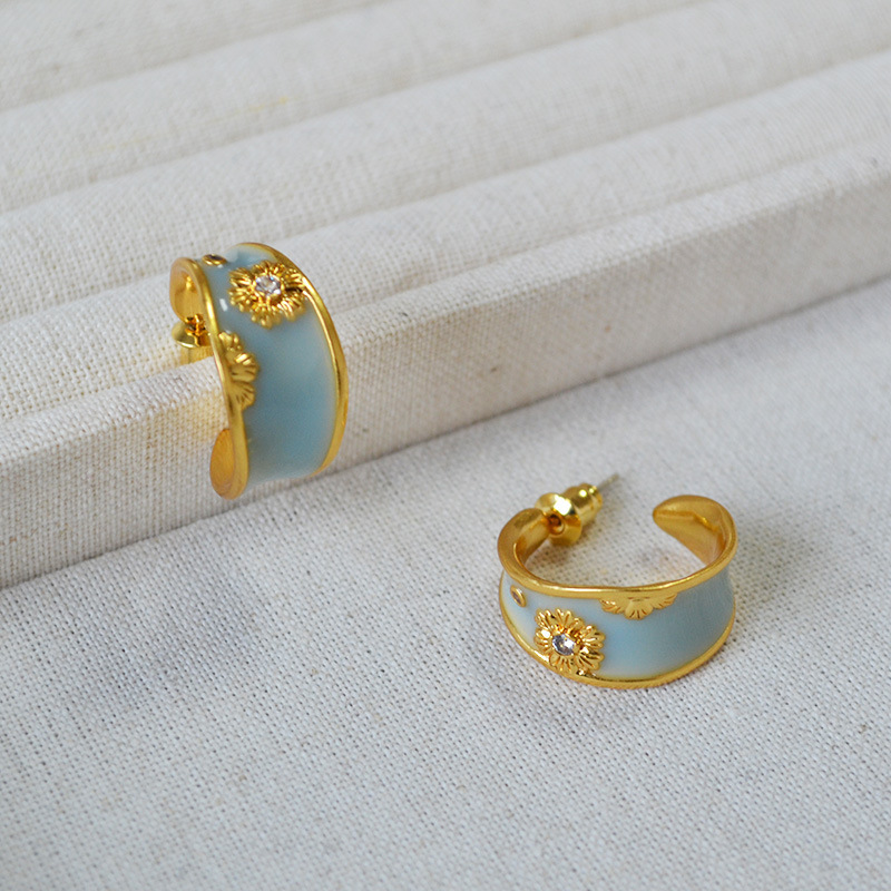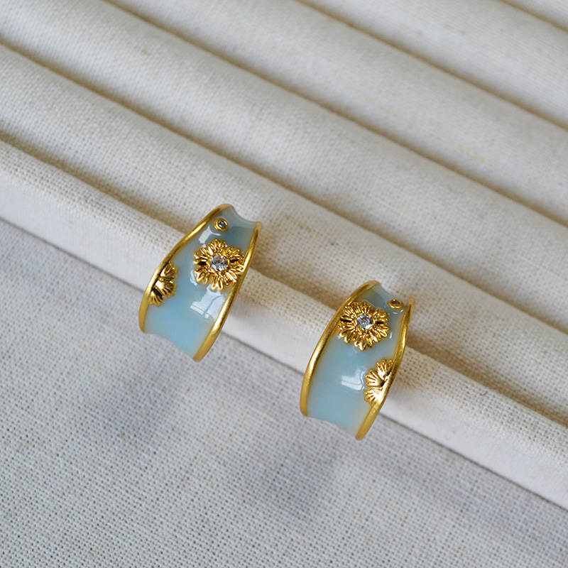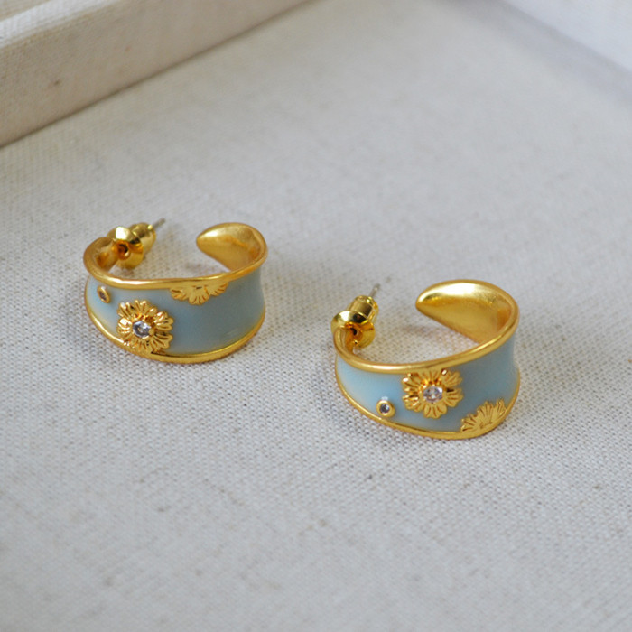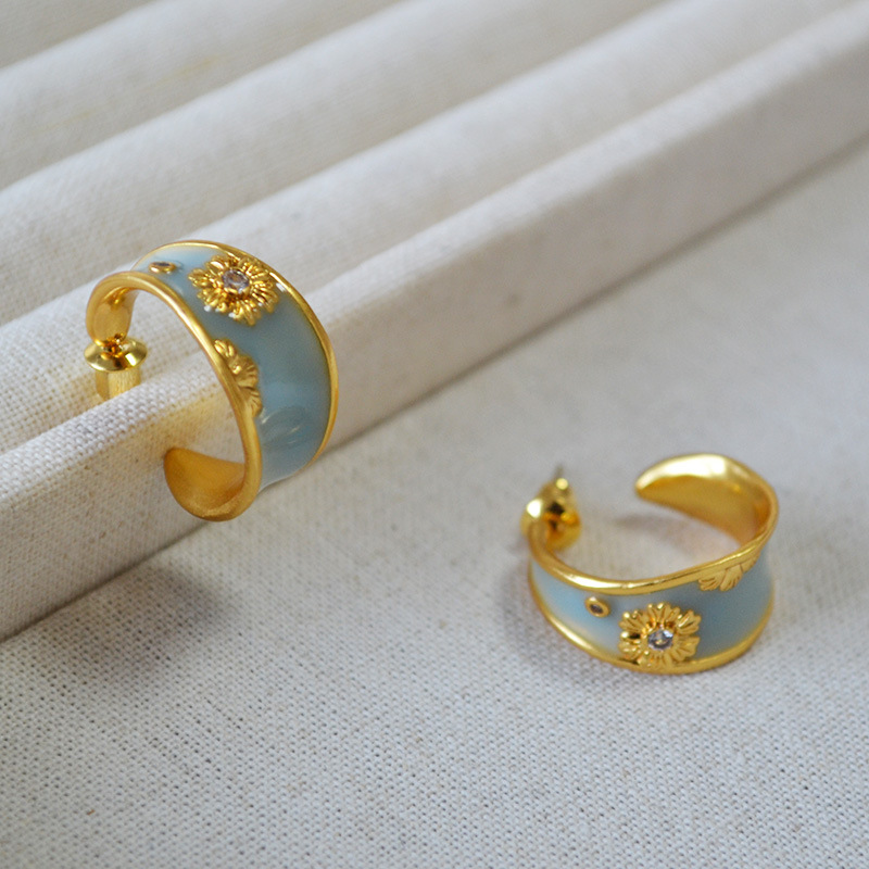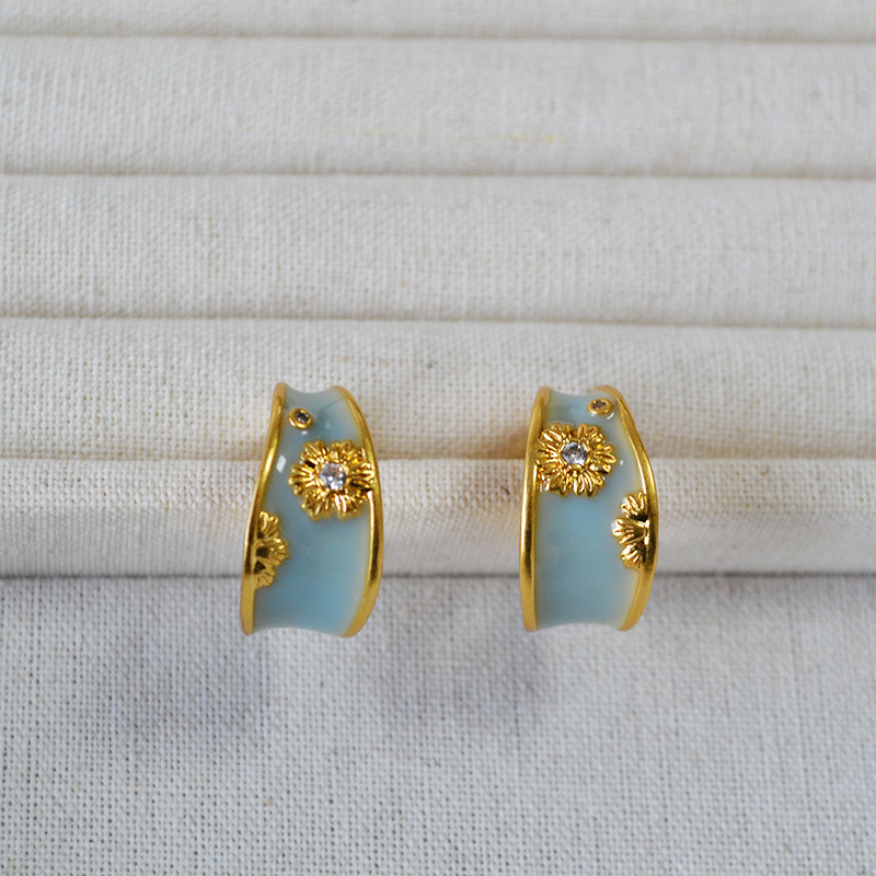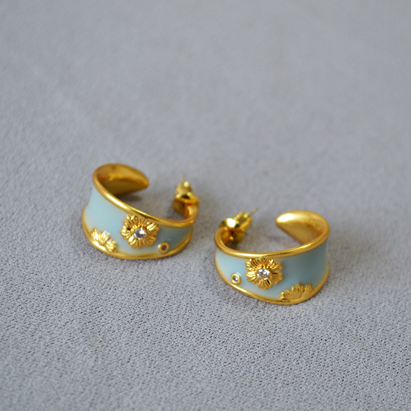 法式文藝復古不規則C字圈手工琺瑯花朵鋯石925銀針耳釘耳飾女