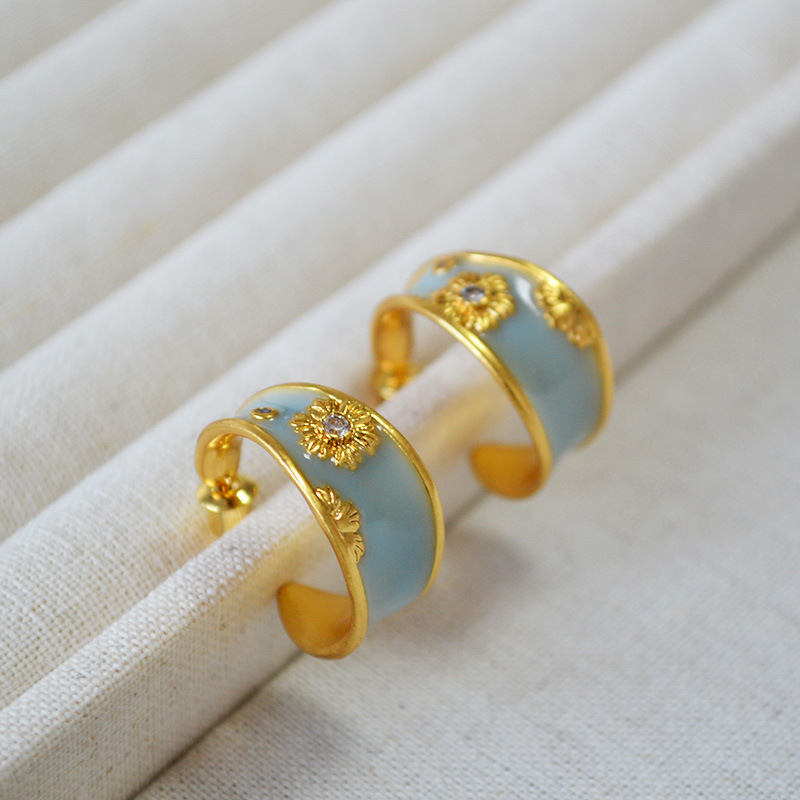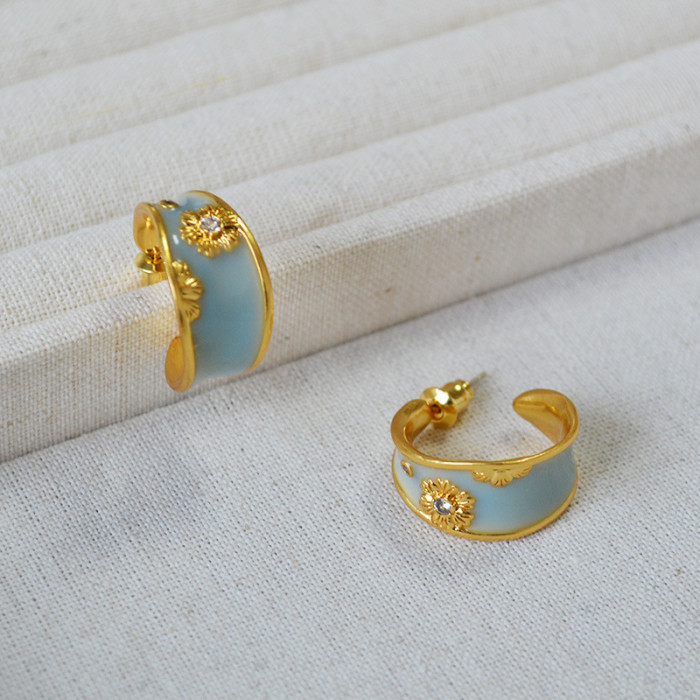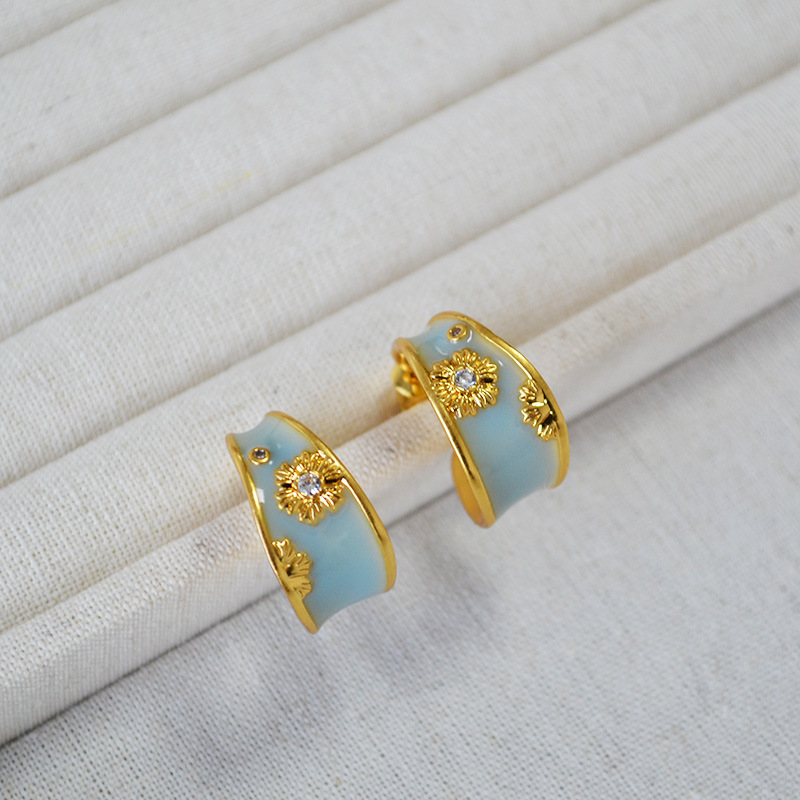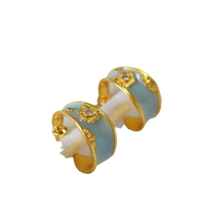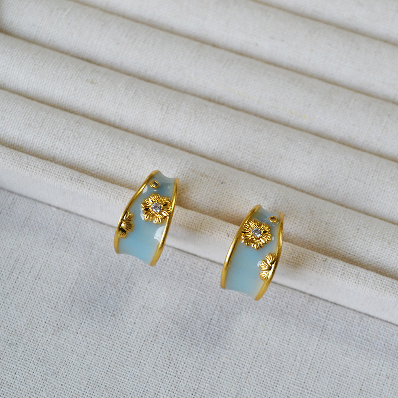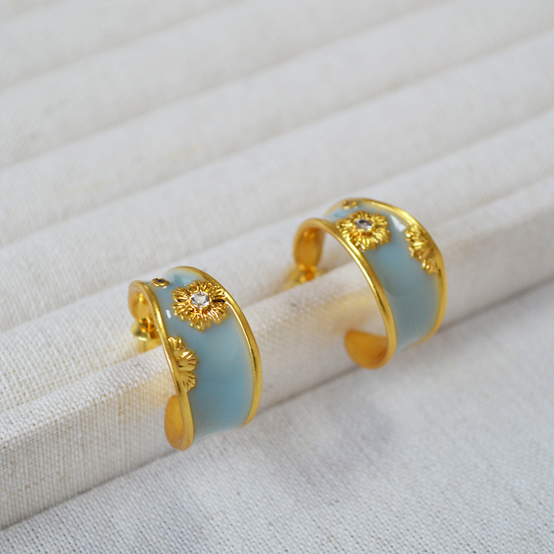法式文藝復古不規則C字圈手工琺瑯花朵鋯石925銀針耳釘耳飾女