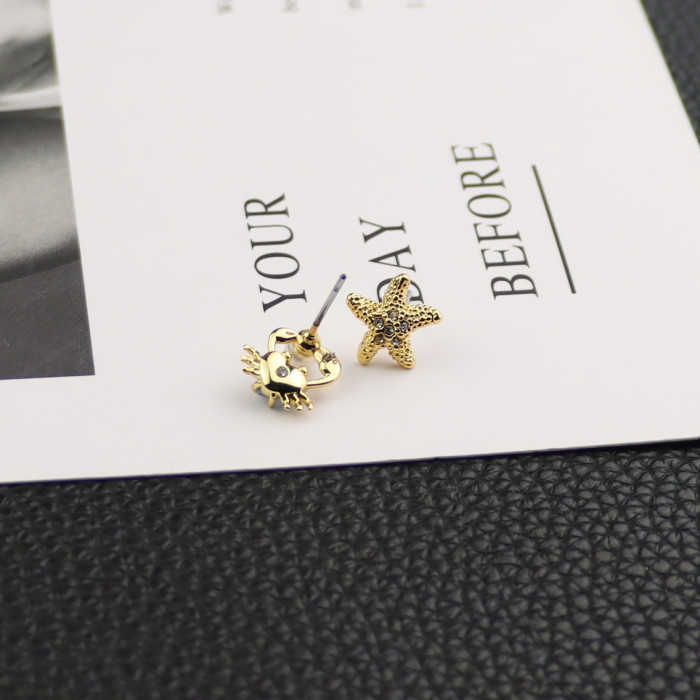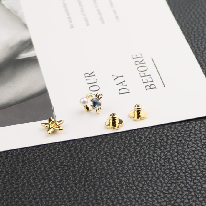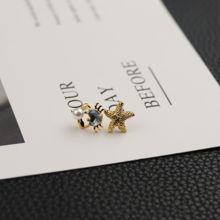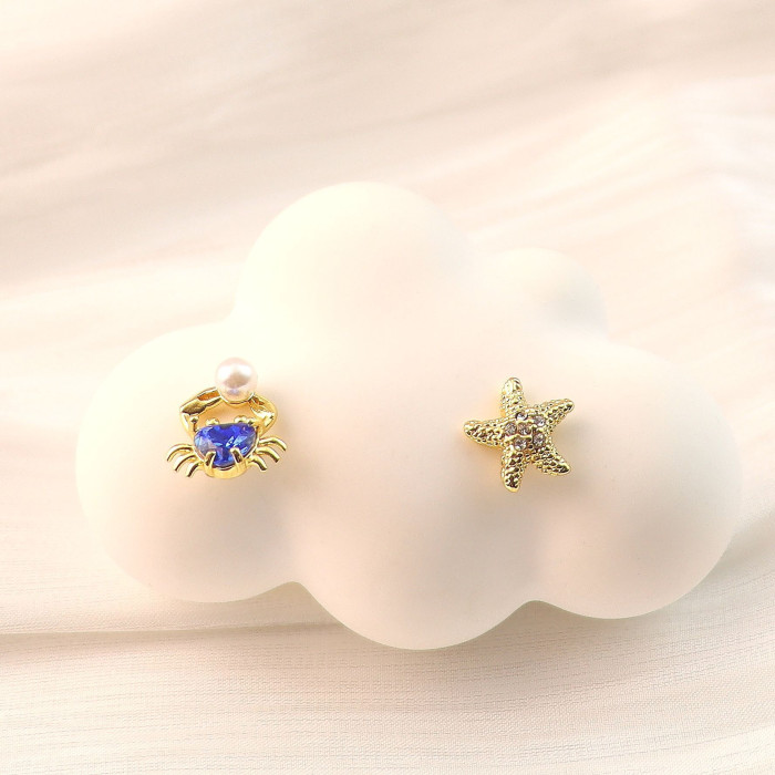歐美飾品海星小螃蟹不對稱耳釘鋯石鑲嵌925銀針耳飾水晶珍珠貝殼
