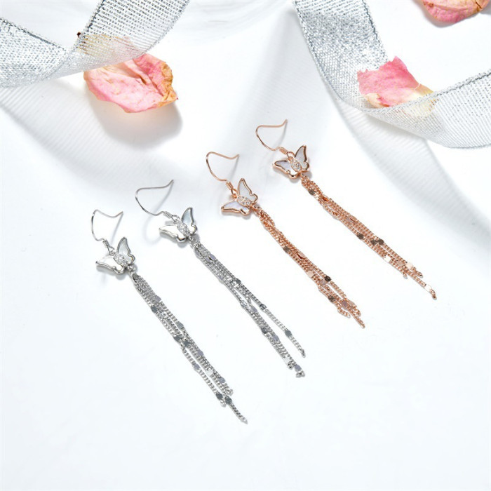 蝴蝶鋯石長款耳鉤-玫瑰金色