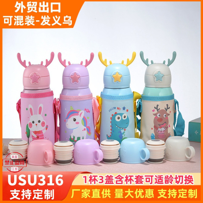 兒童吸管杯大容量可攜式卡通兒童水壺316不鏽鋼鹿角兒童保溫杯
