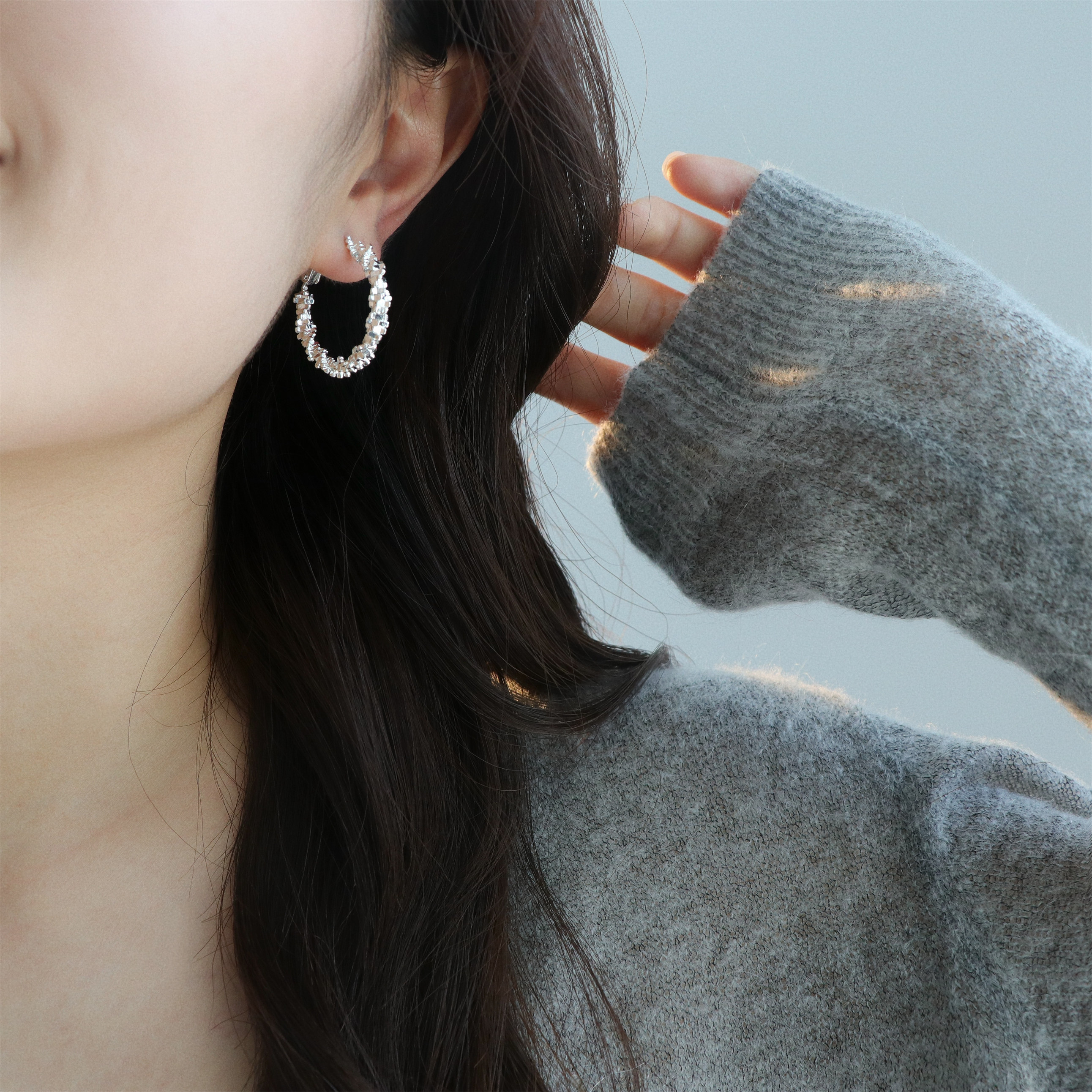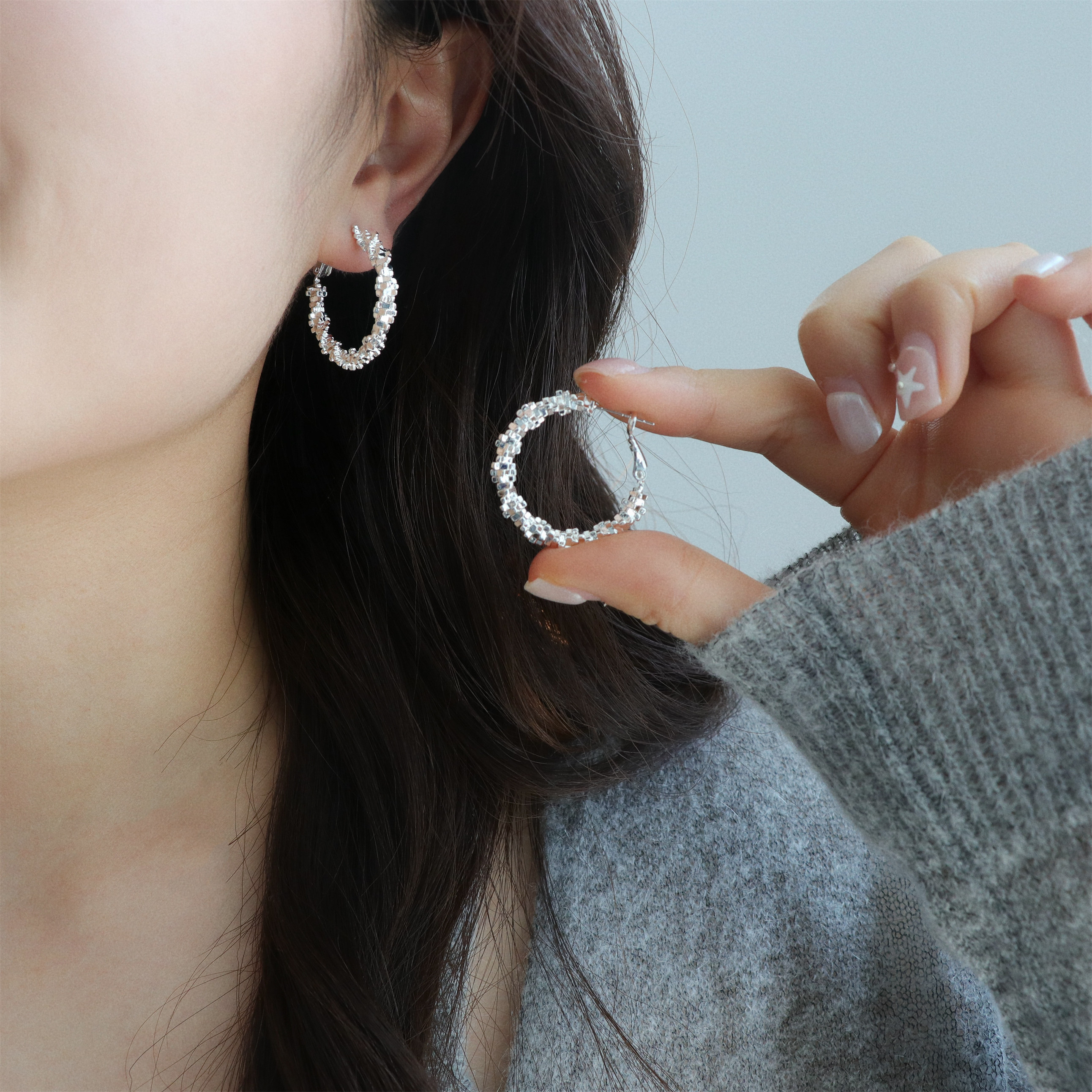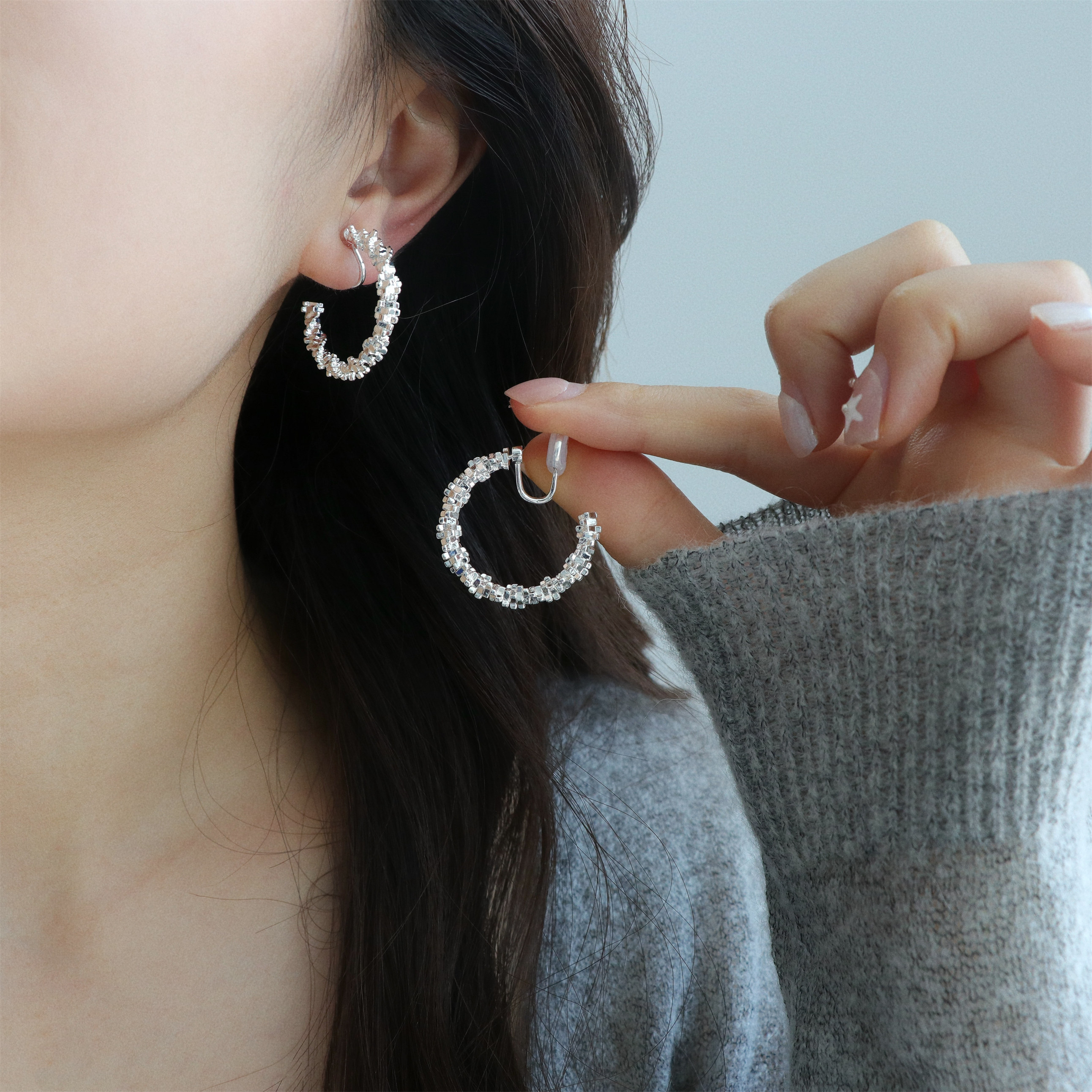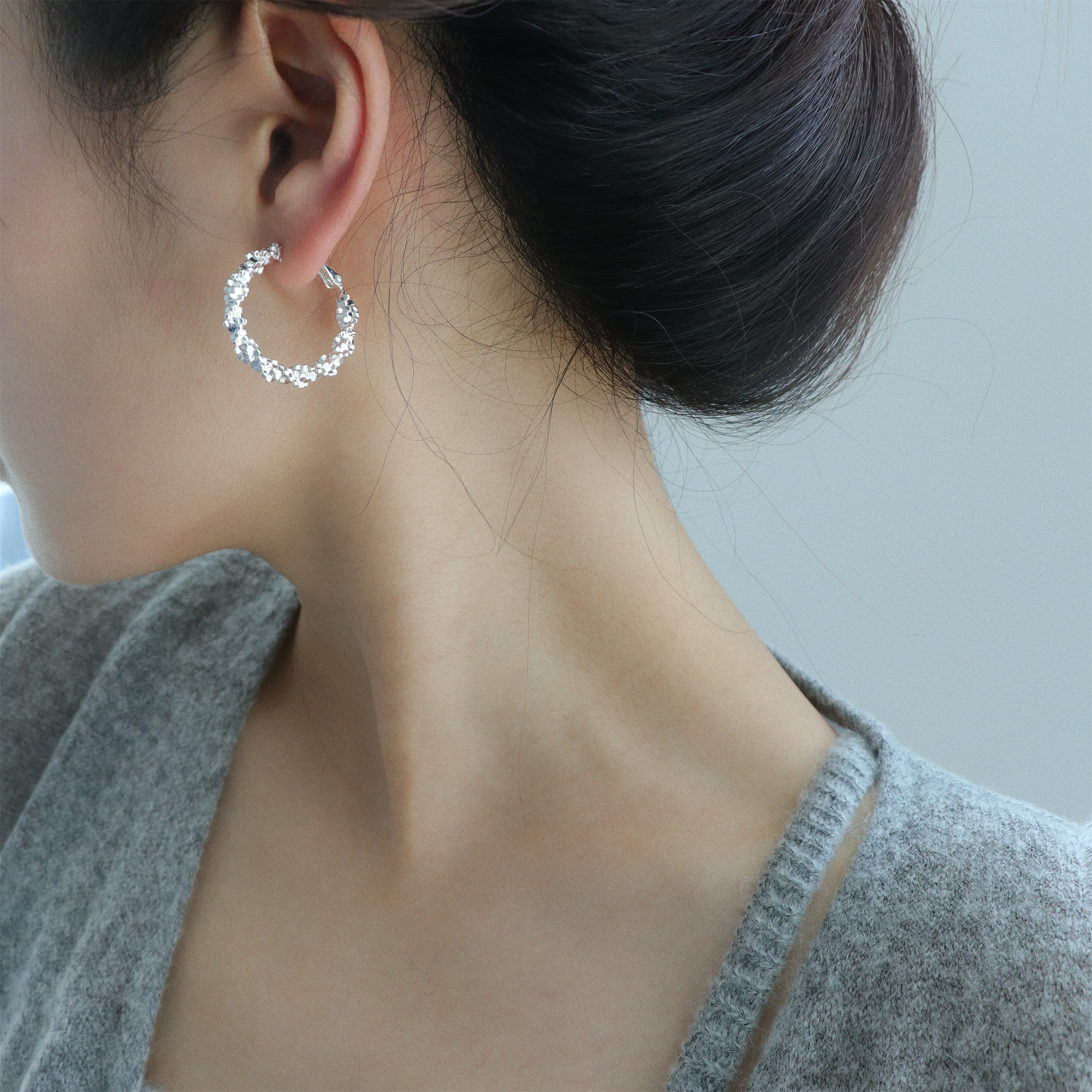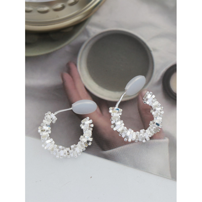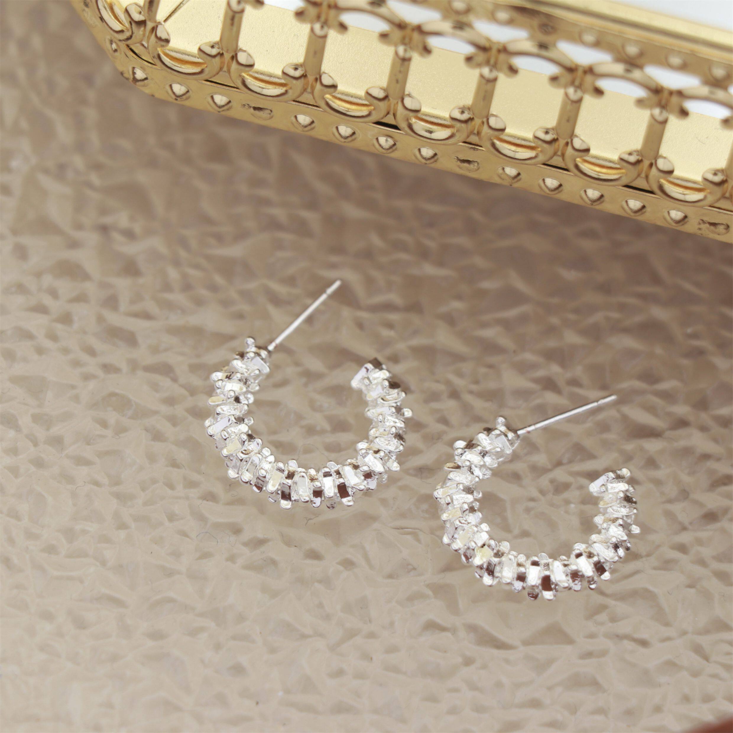 因缺斯汀s925銀針波光粼粼金屬耳圈碎銀子無耳洞蚊香盤耳夾女小衆