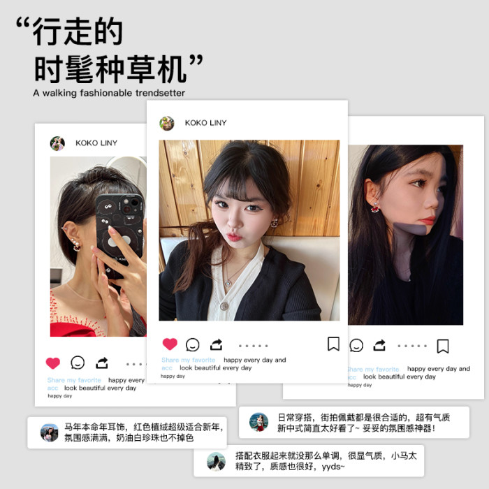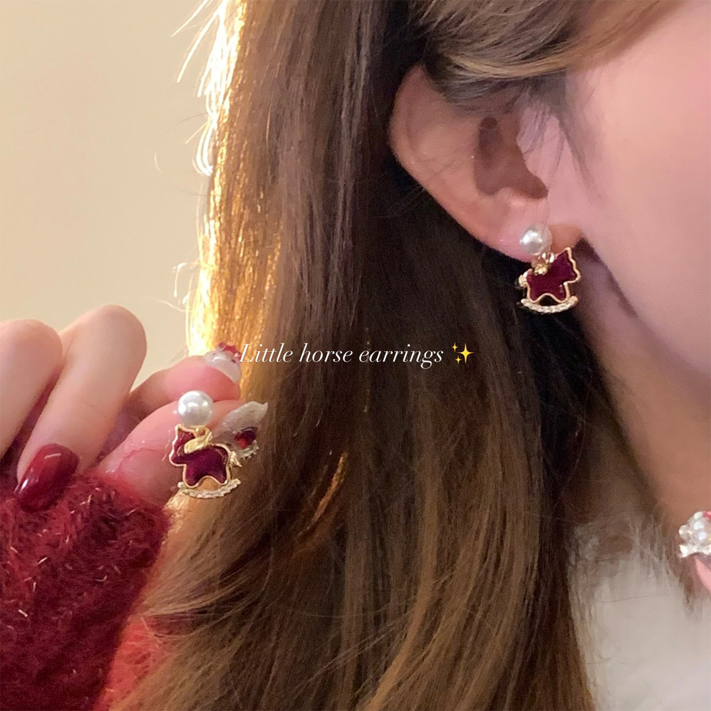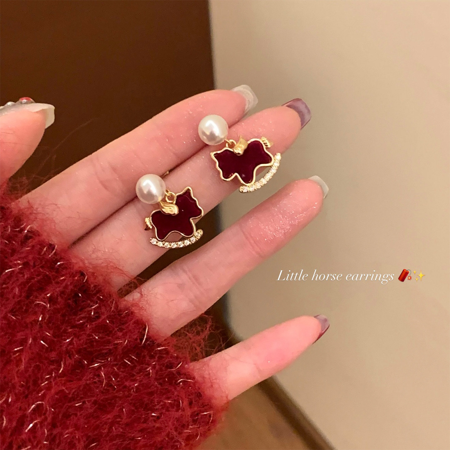 復古紅絲絨小馬吊墜珍珠耳釘女輕奢高級感巨好看耳環獨特漂亮耳飾