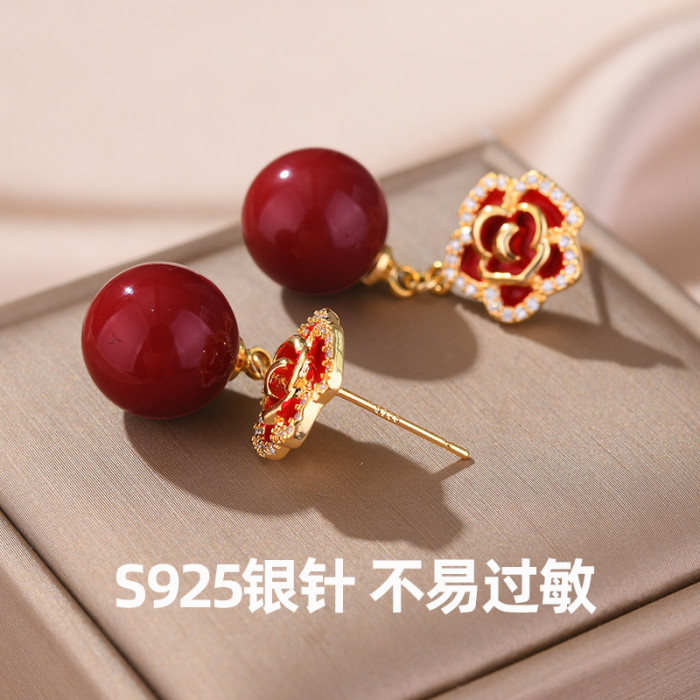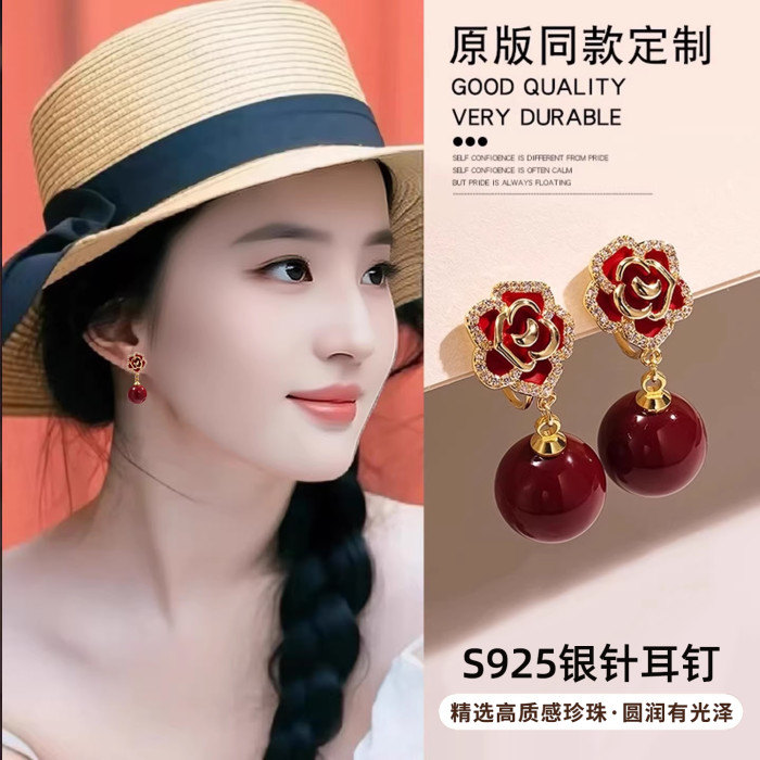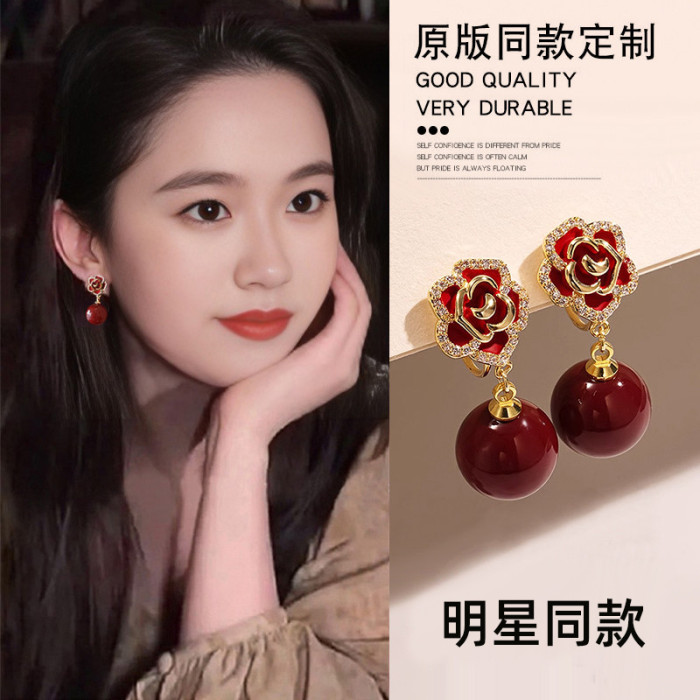 紅色珍珠耳夾無耳洞女耳環高級感耳飾2026新款爆款輕奢山茶花耳釘