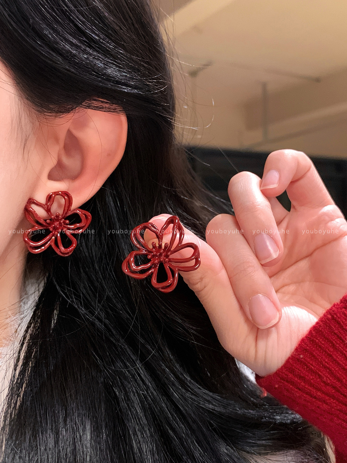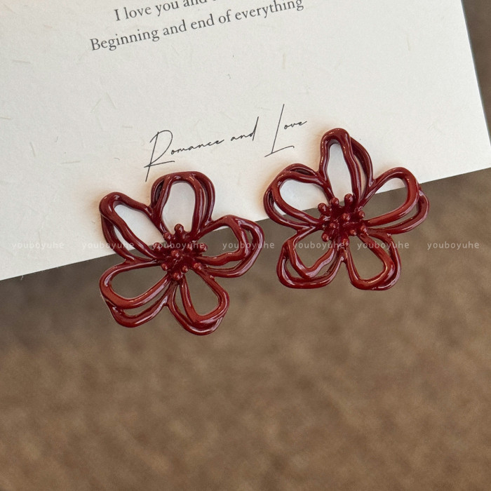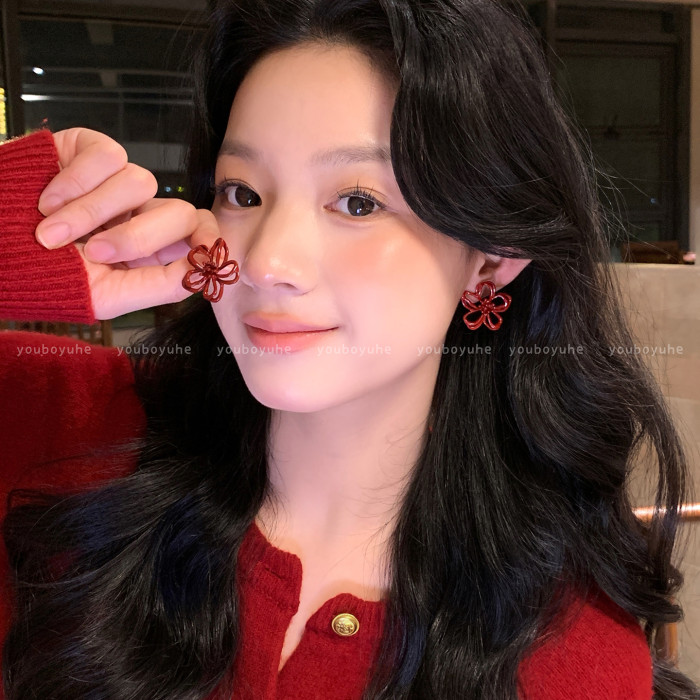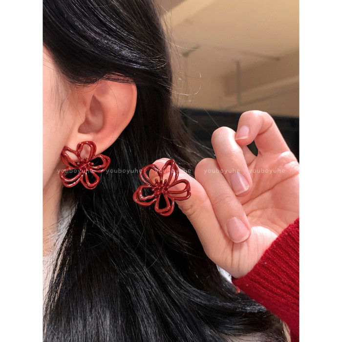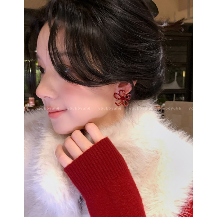 新年酒紅色花朵鏤空耳釘女輕奢高級感秋冬顯白耳環無耳洞耳夾耳飾