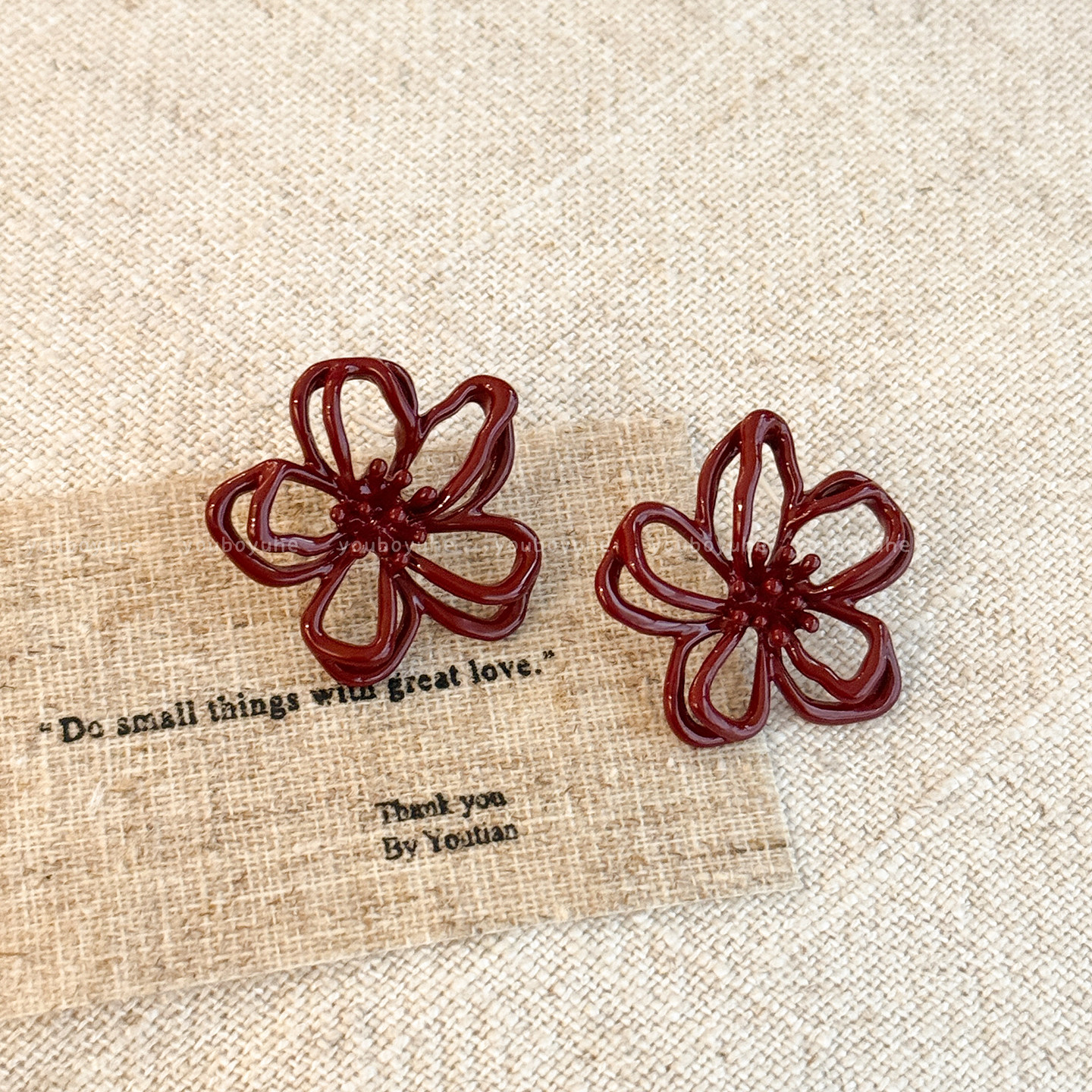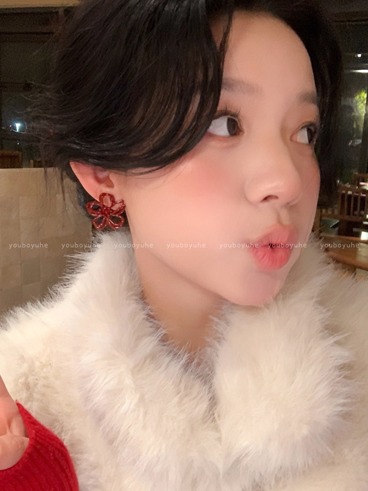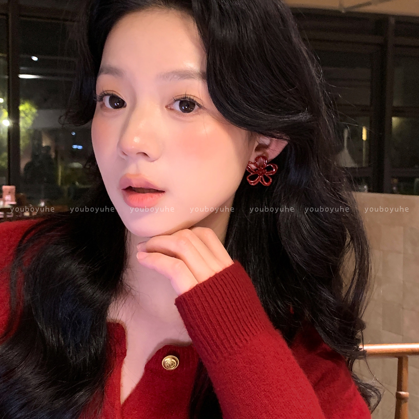 新年酒紅色花朵鏤空耳釘女輕奢高級感秋冬顯白耳環無耳洞耳夾耳飾