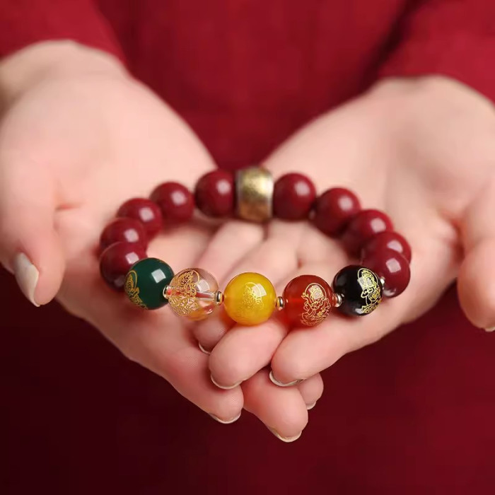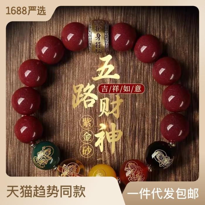 高含量天然原礦硃砂五路財神手串男紫金砂圓珠五彩行手鏈女