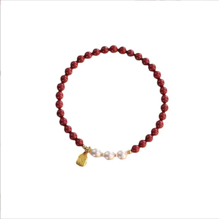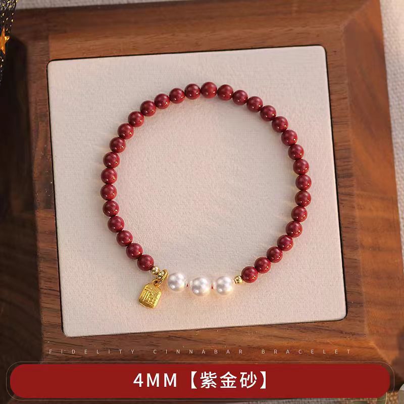原創設計天然硃砂手串本命年福牌硃砂手鏈女珍珠紫金砂手串禮物