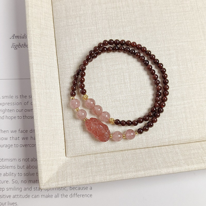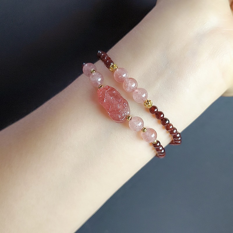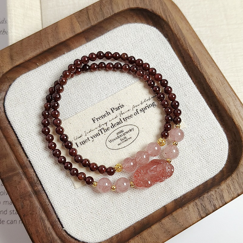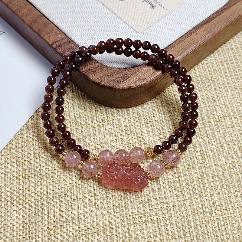 新中式天然酒紅石榴石雙圈手鏈小衆復古草莓晶貔貅復古手串閨蜜款