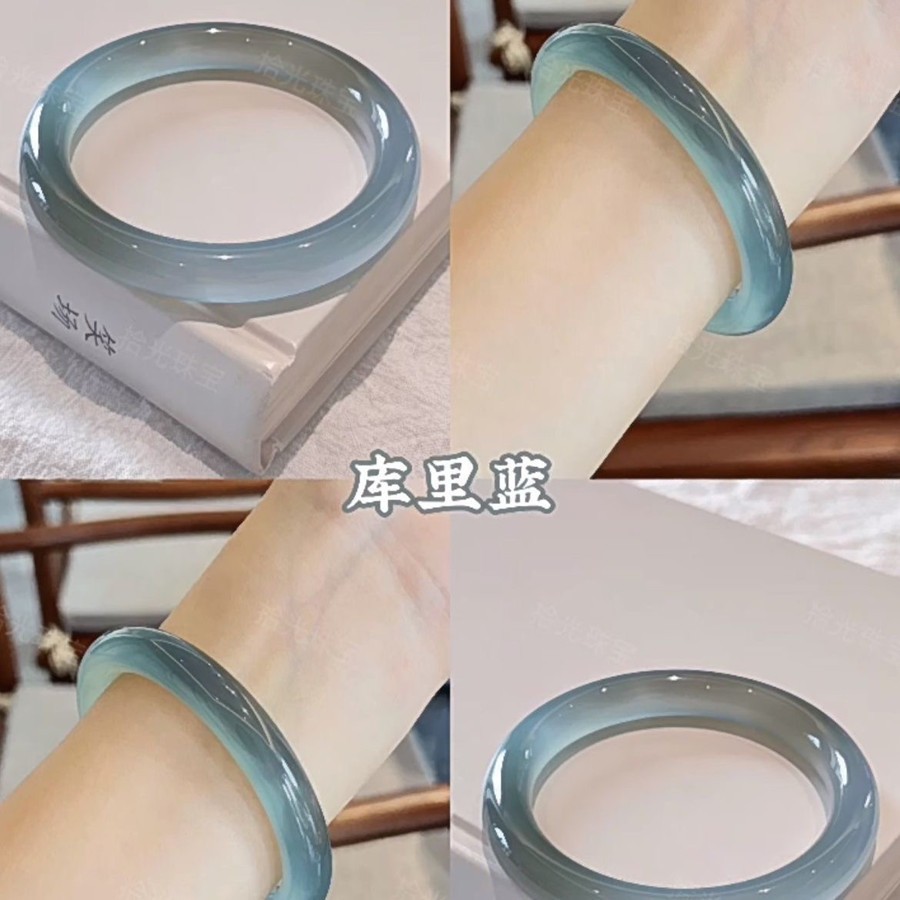 庫里藍天然瑪瑙玉髓手鐲女款冰透藍水色胖圓條玉鐲美人條圓鐲鐲子