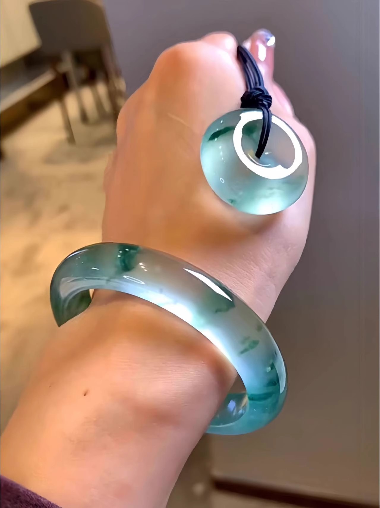 冰種飄花翡翠正圈手鐲女天然緬甸平安釦玉吊墜玻璃種吊墜鐲子套裝