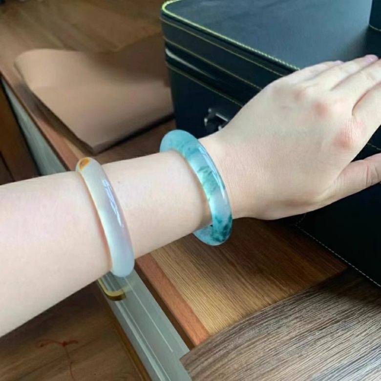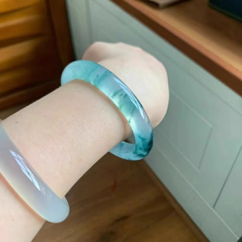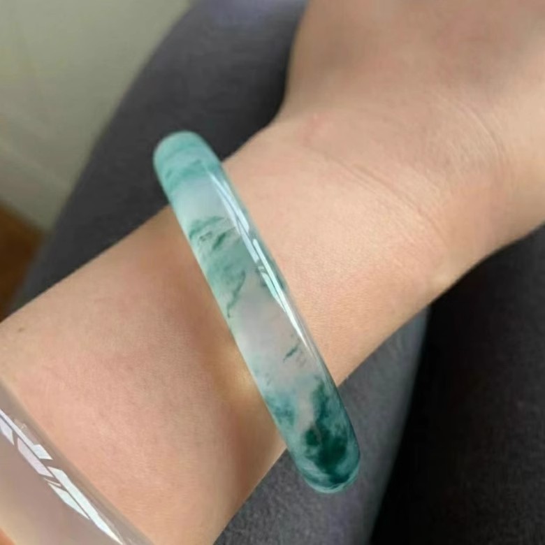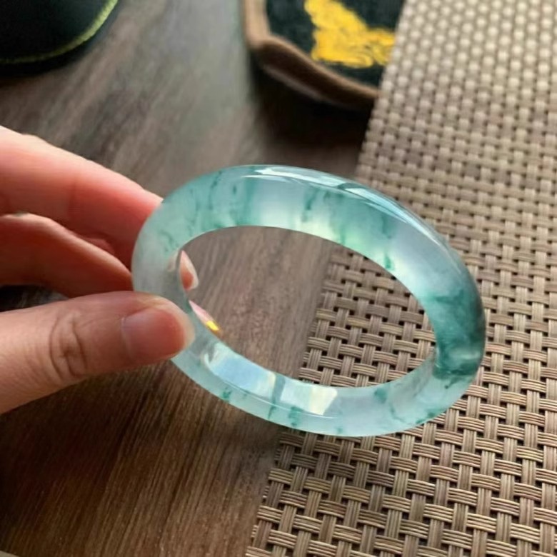 天然冰種翡翠玉手鐲藍飄花正圈女款緬甸天山翠老坑種平安鐲子晴水