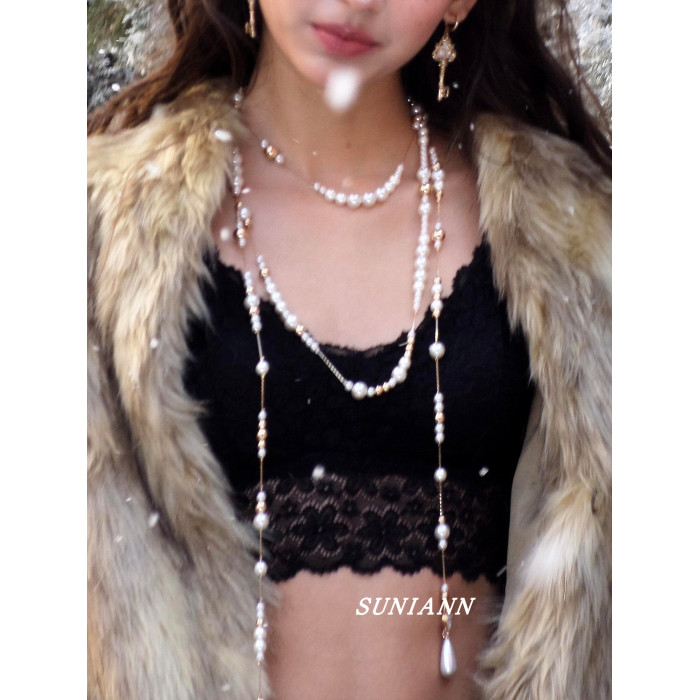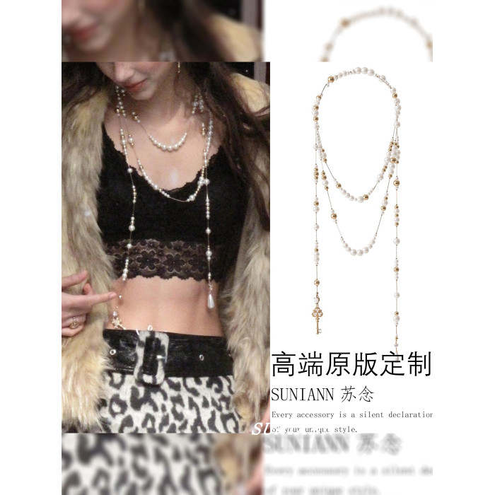 復古鑰匙水滴珍珠長款曡戴項鍊女輕奢高級感多層鎖骨鍊毛衣鏈生日