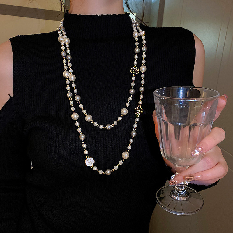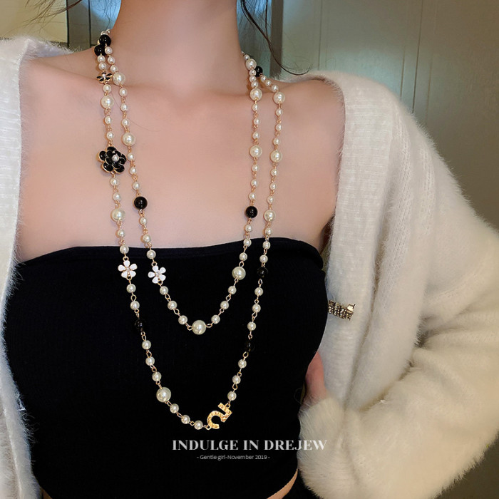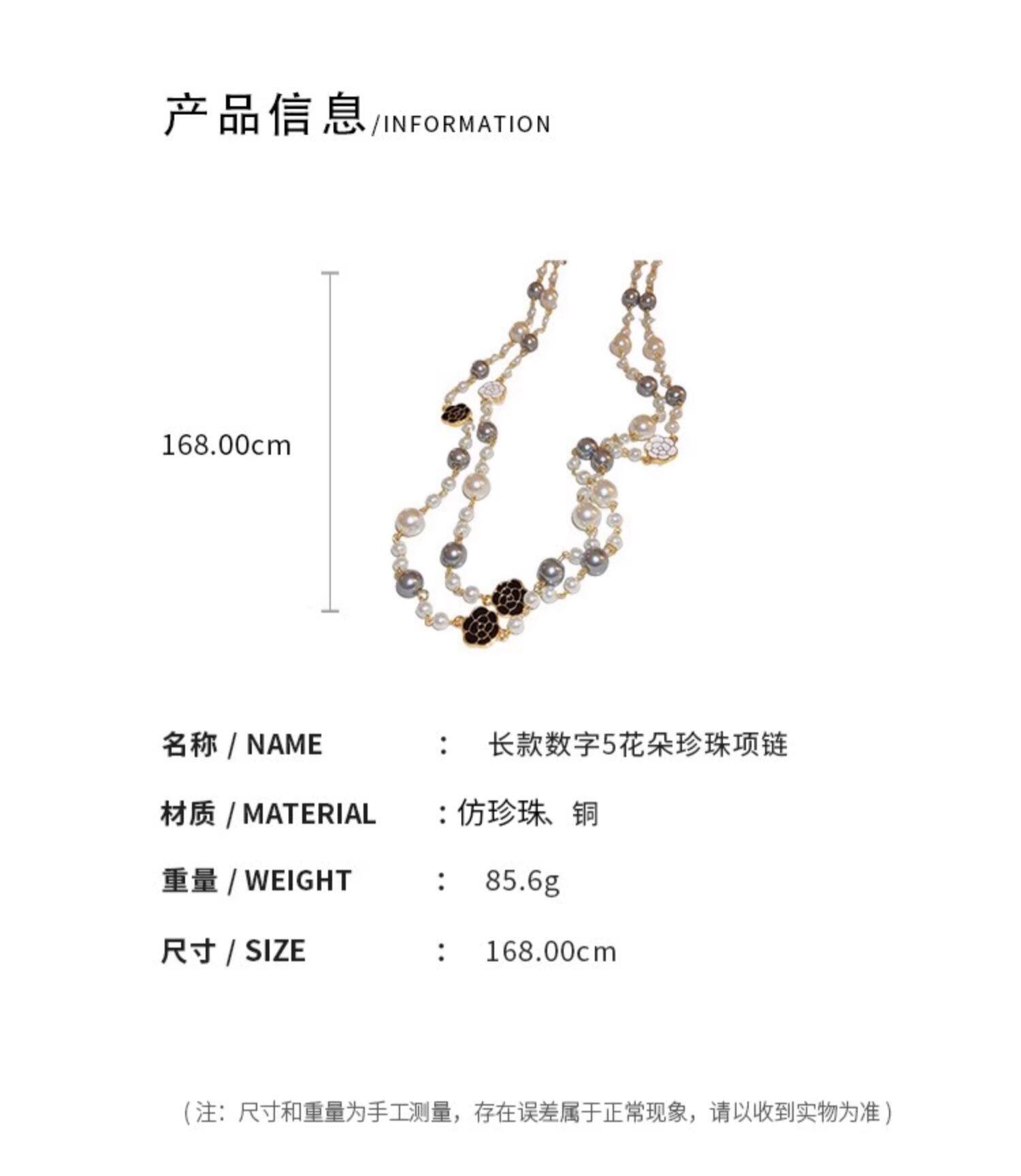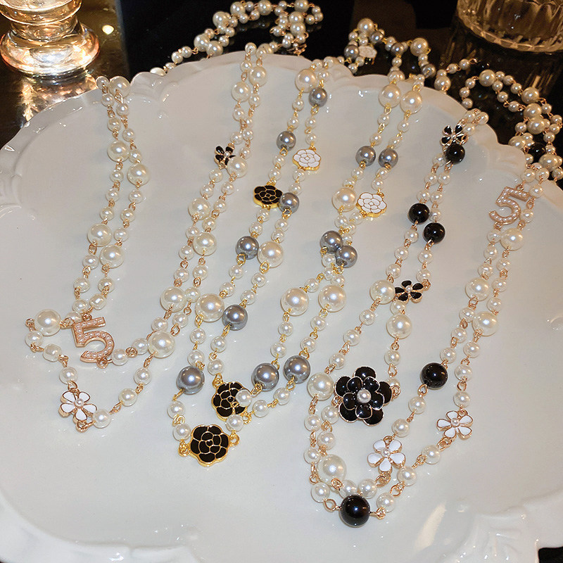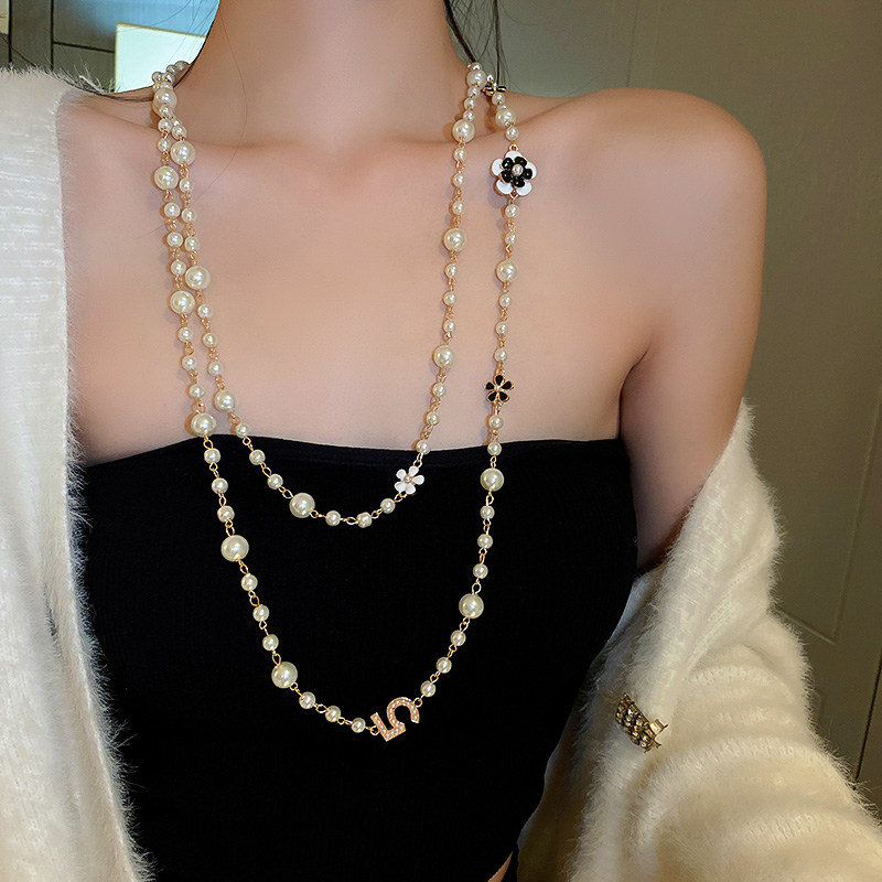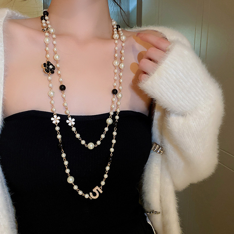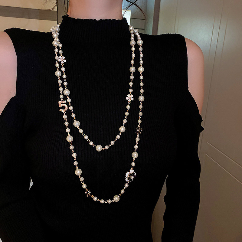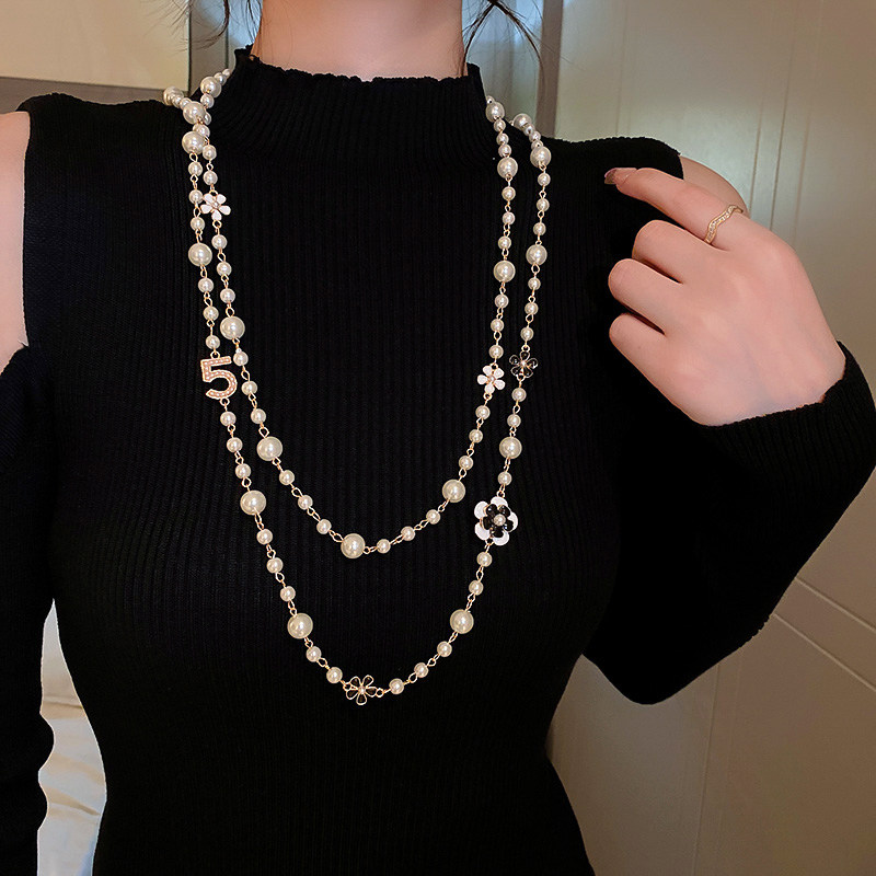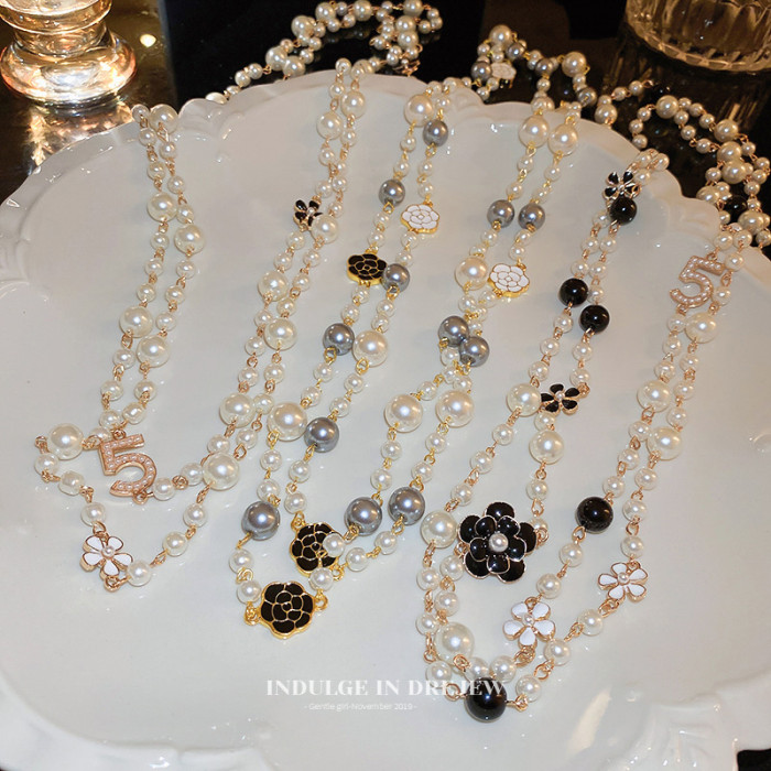 小香風山茶花數字5珍珠毛衣鏈長款項鍊輕奢小衆秋冬曡戴頸鏈配飾