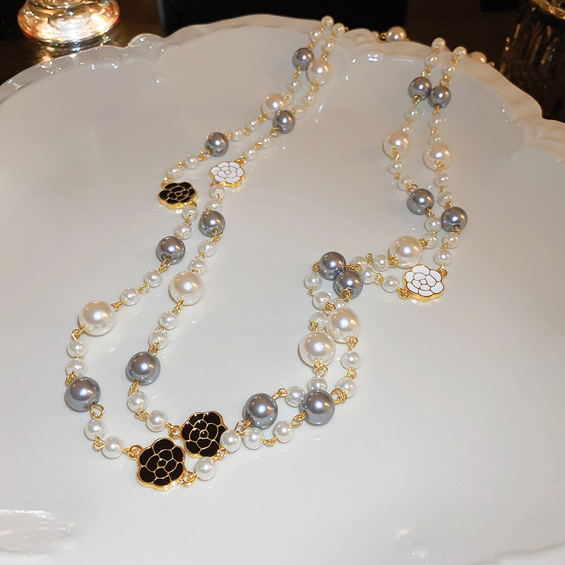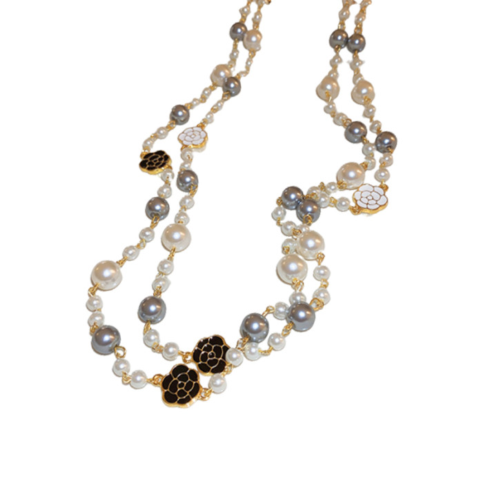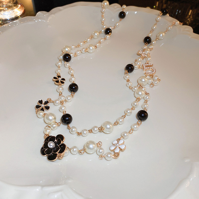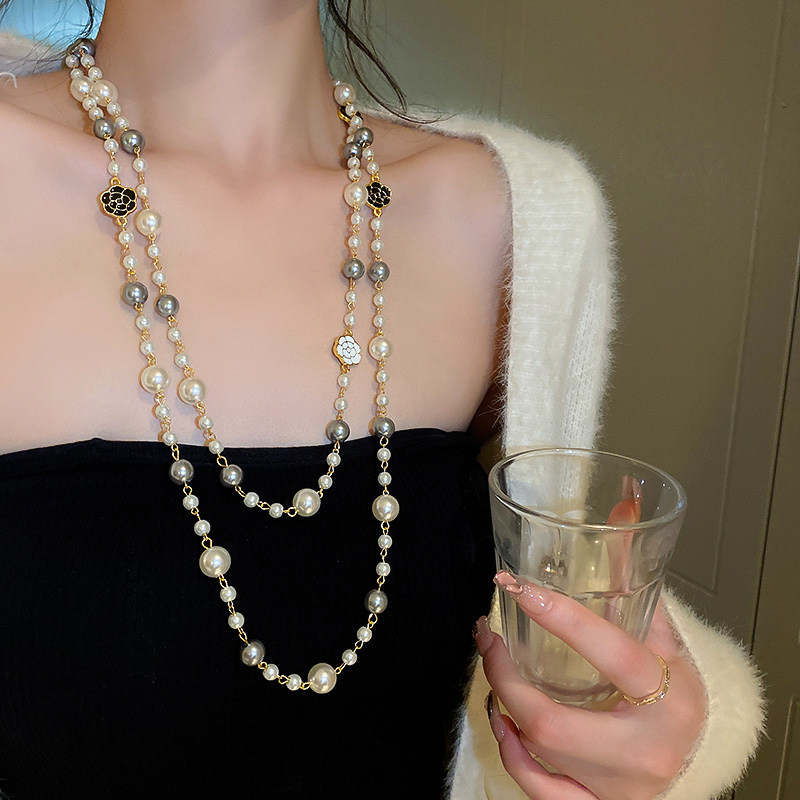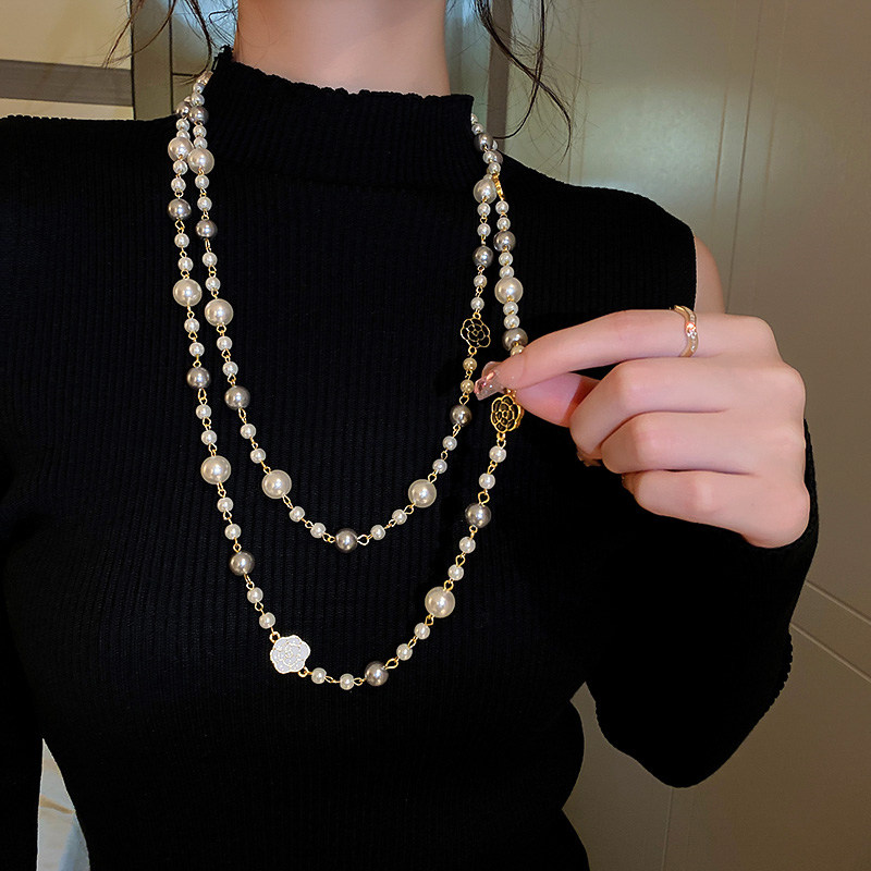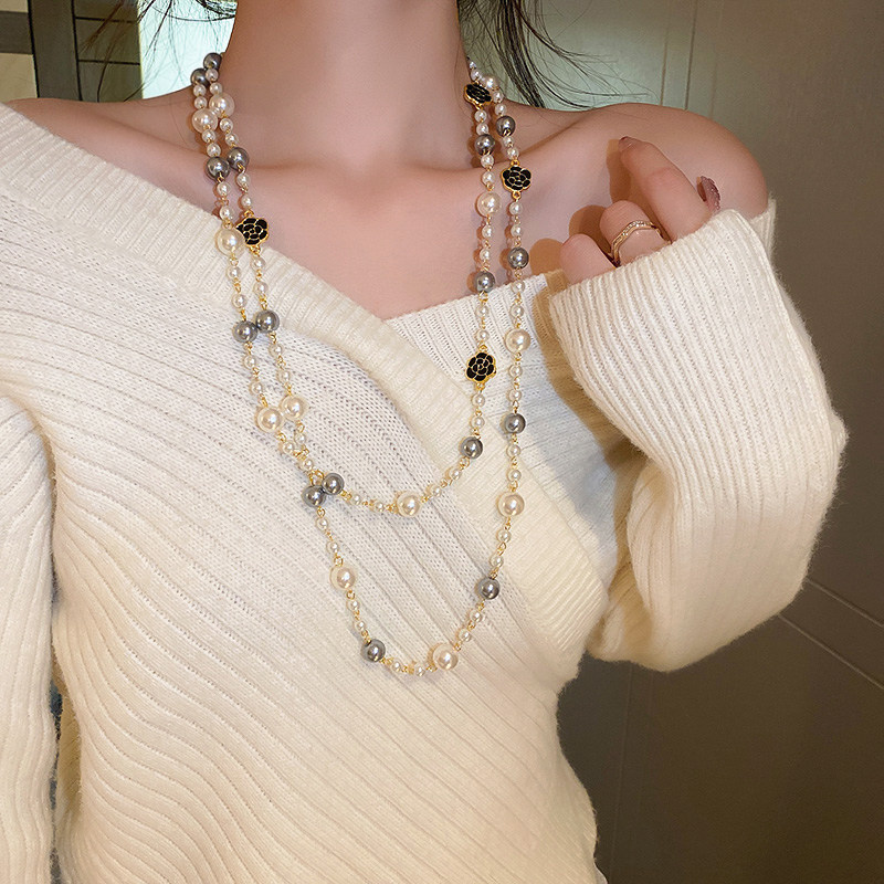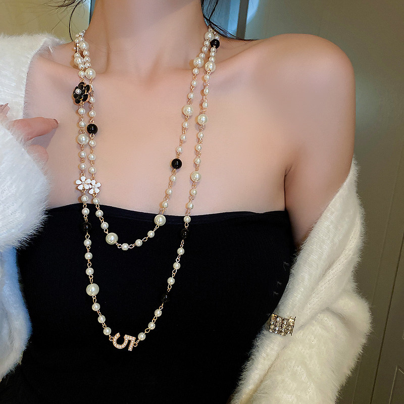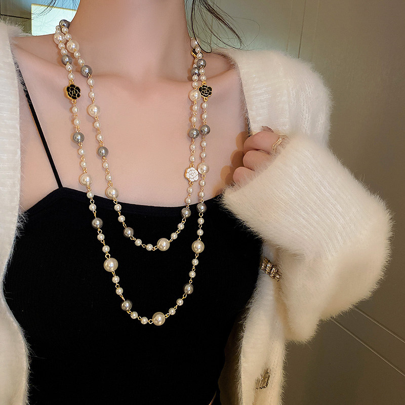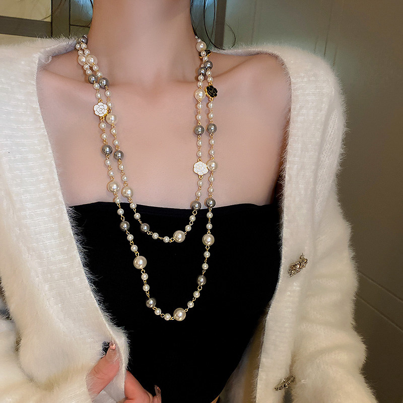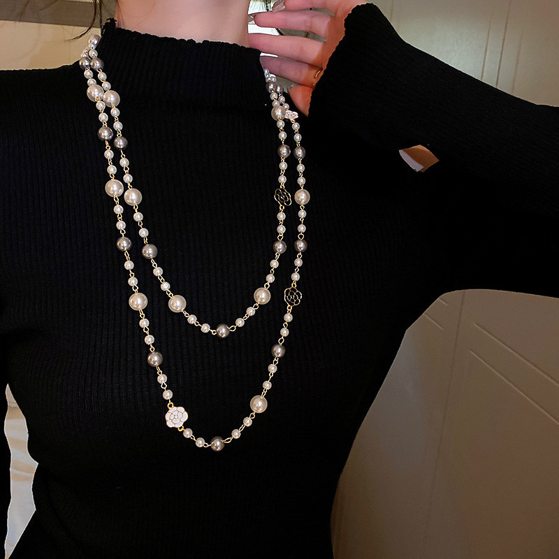 小香風山茶花數字5珍珠毛衣鏈長款項鍊輕奢小衆秋冬曡戴頸鏈配飾