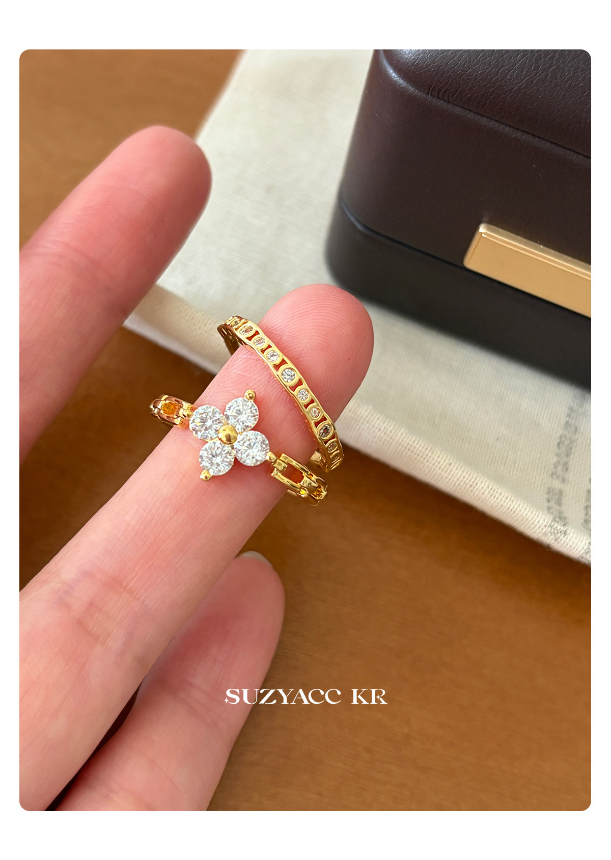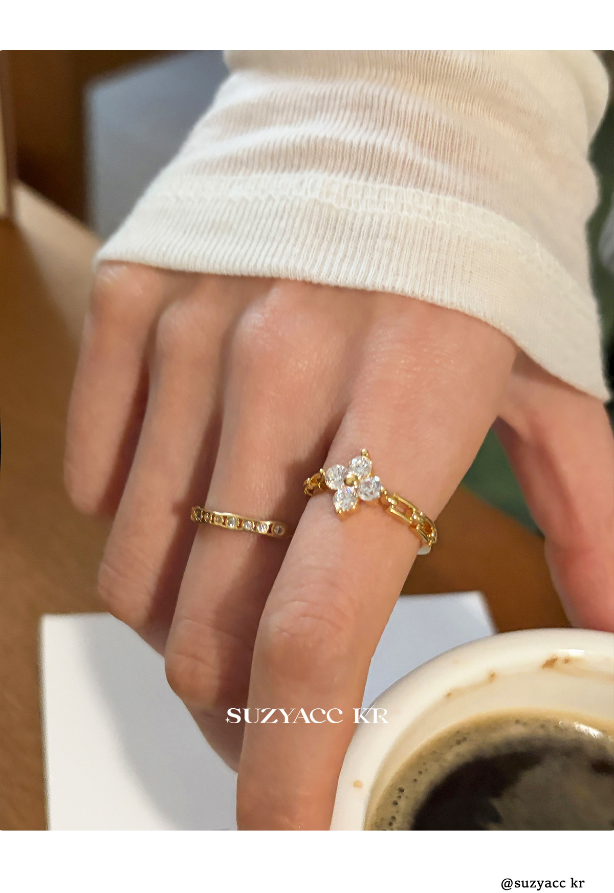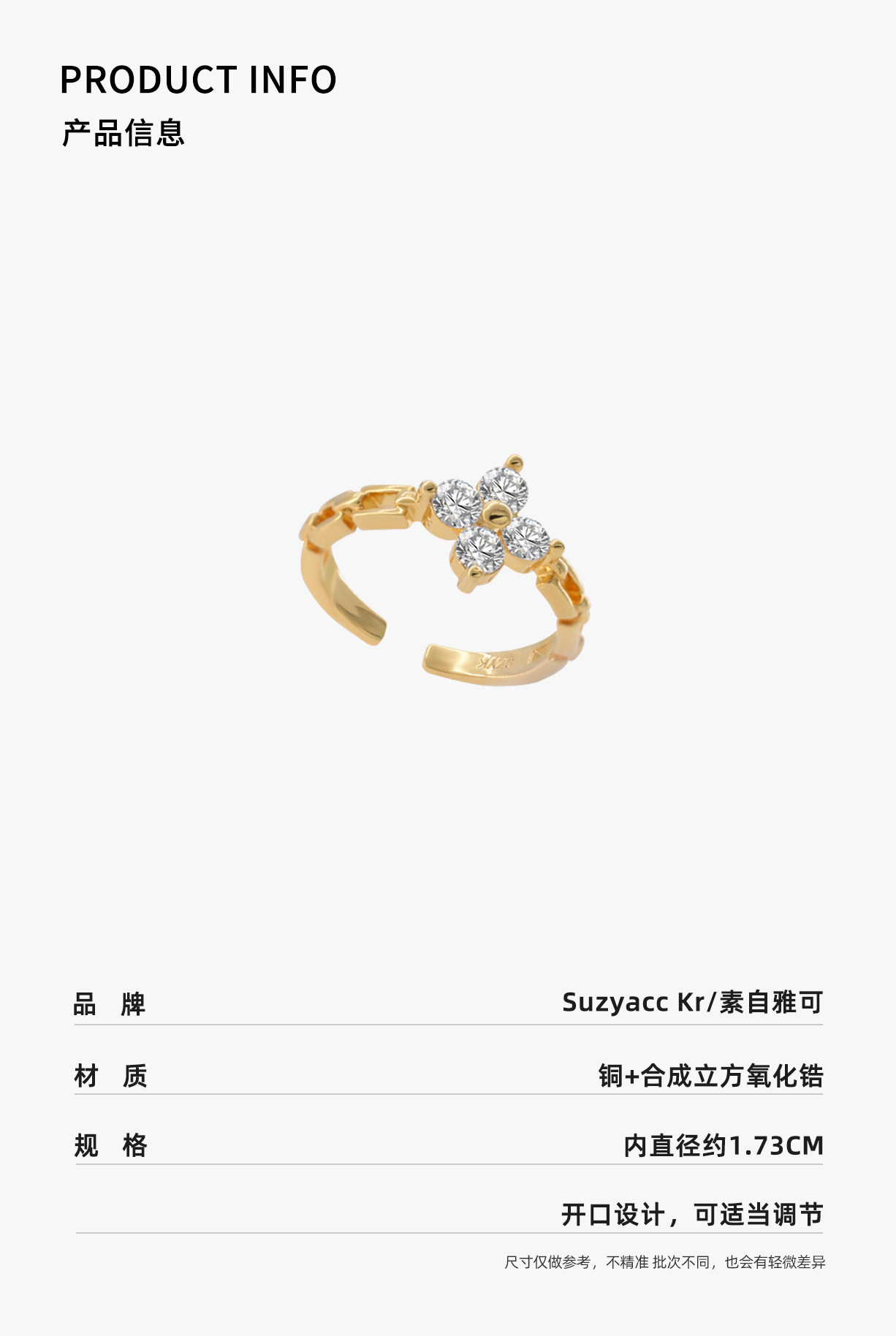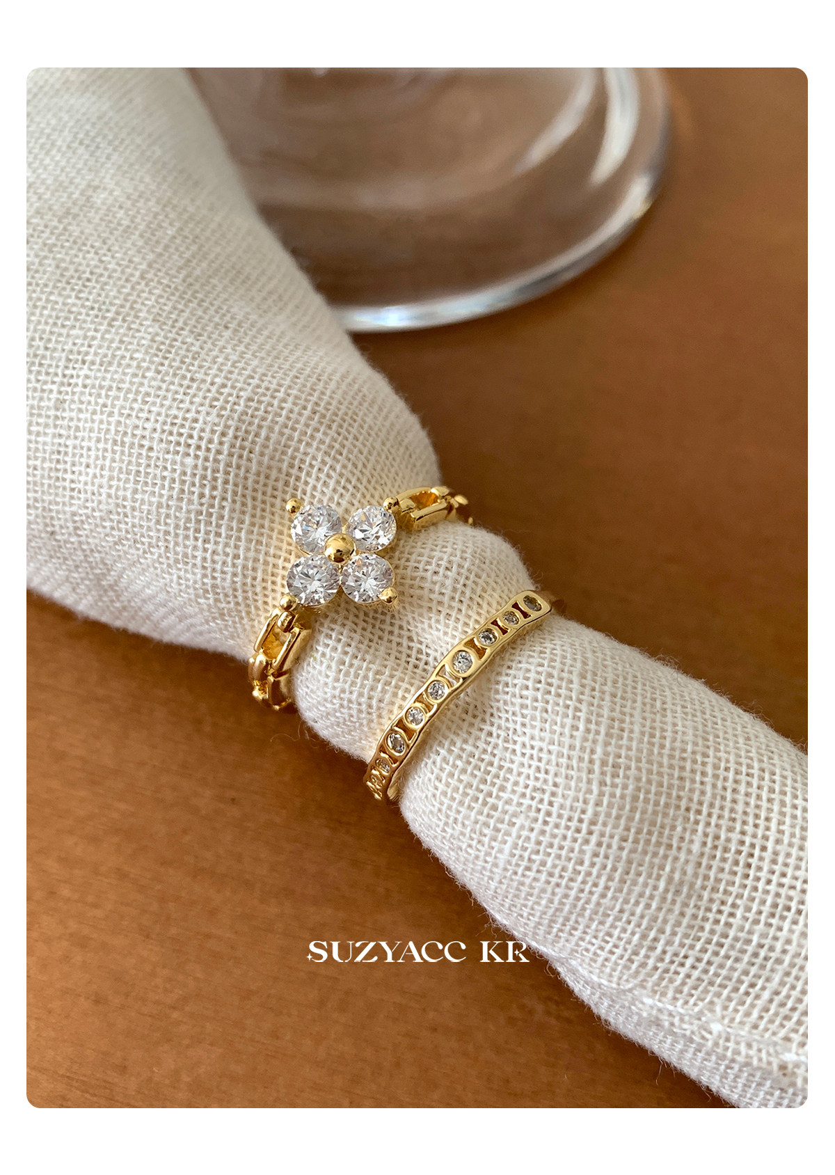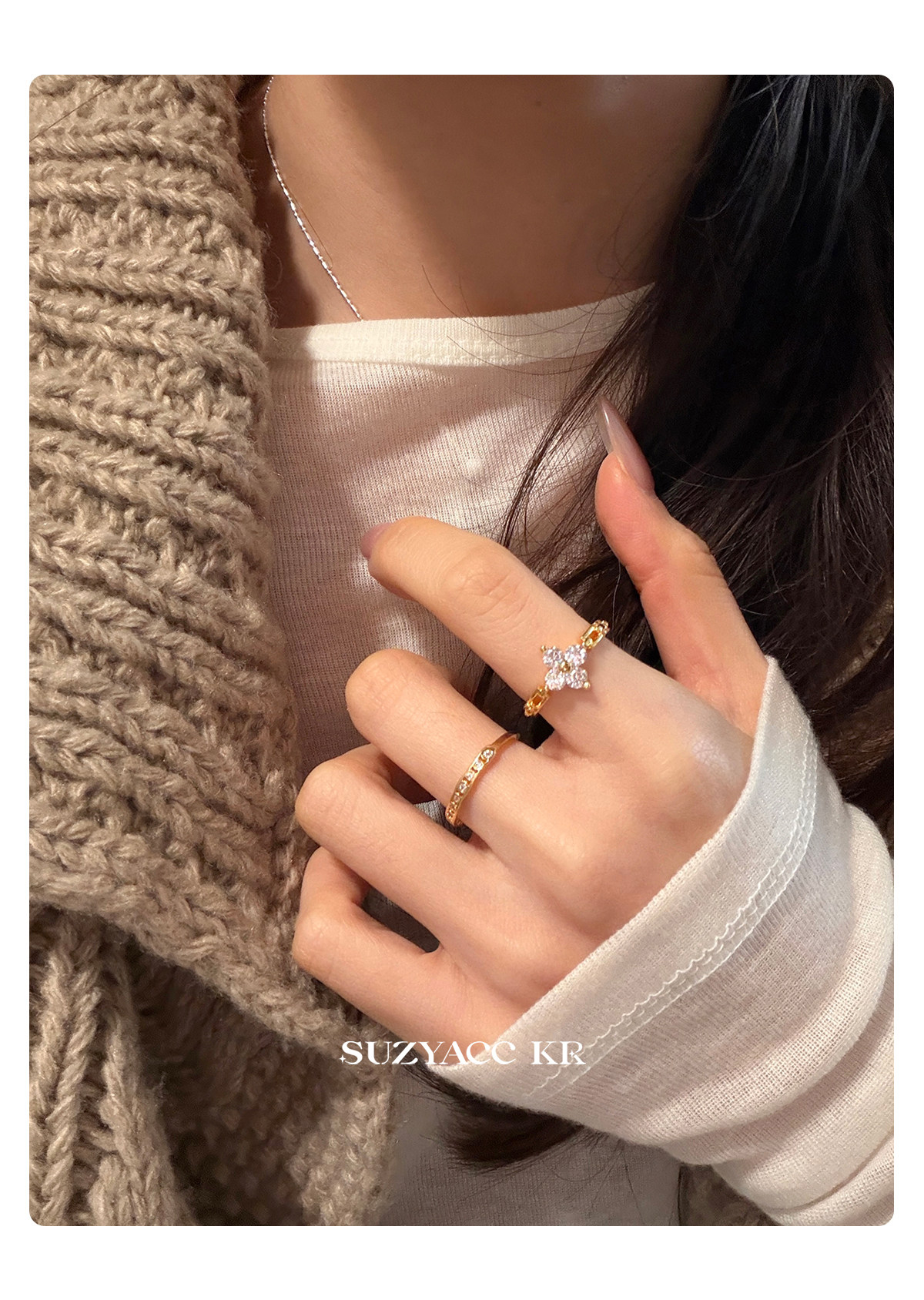suzyacc kr合成鋯石四葉草鏈條戒指小衆設計感食指戒氣質高級指環