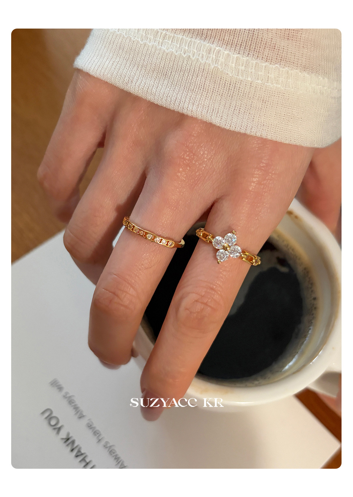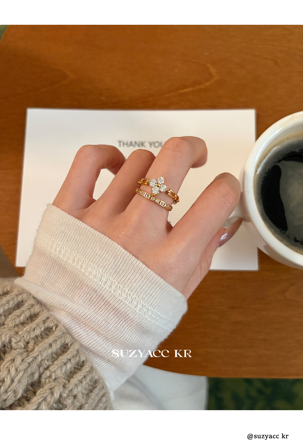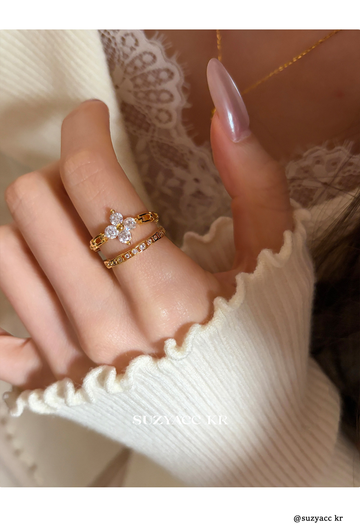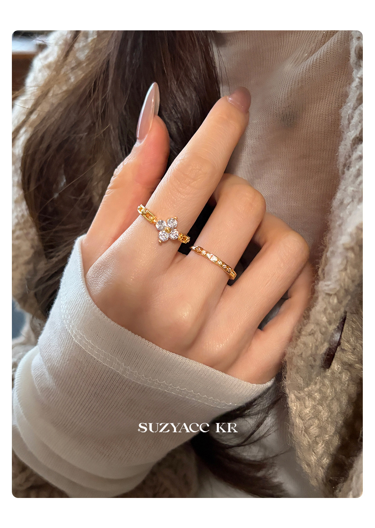 suzyacc kr合成鋯石四葉草鏈條戒指小衆設計感食指戒氣質高級指環