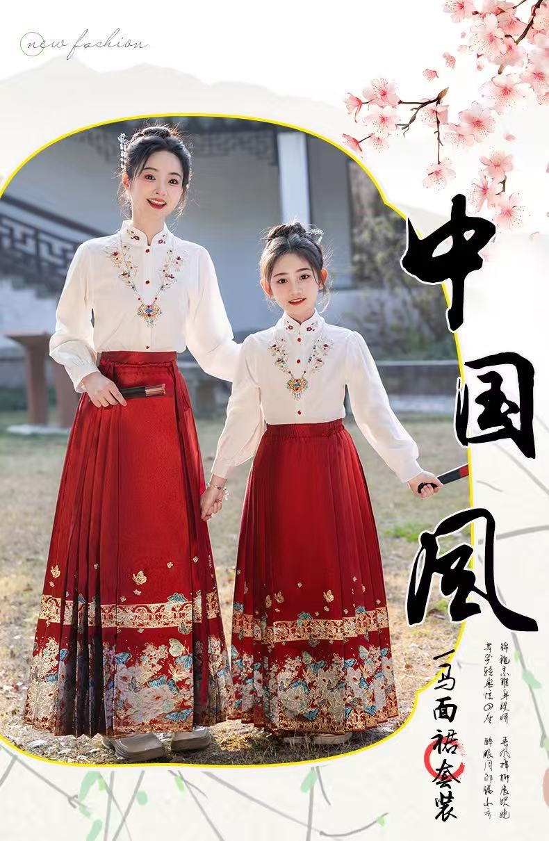 女童織金馬面裙套裝2025春夏新款兒童新風漢服短袖母女親子裝