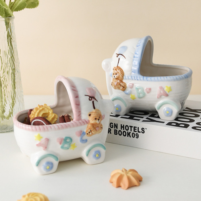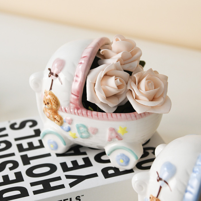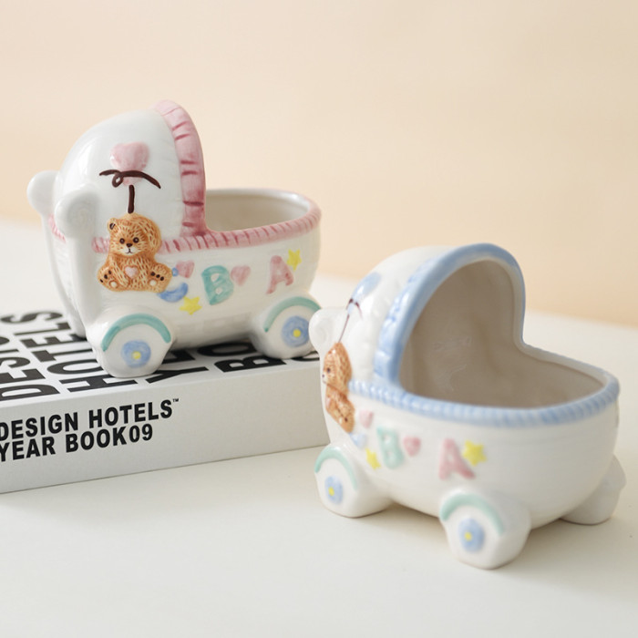 可愛熊少女心陶瓷花缸嬰兒車籃金絲熊倉鼠收納盒花籃裝飾擺件