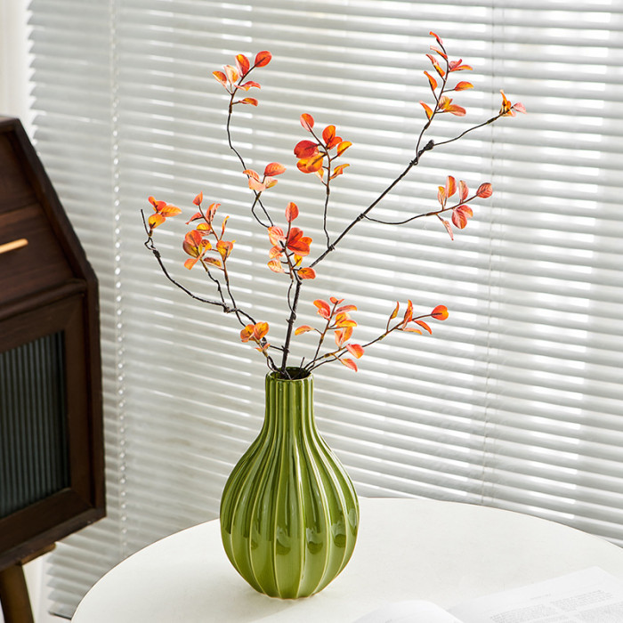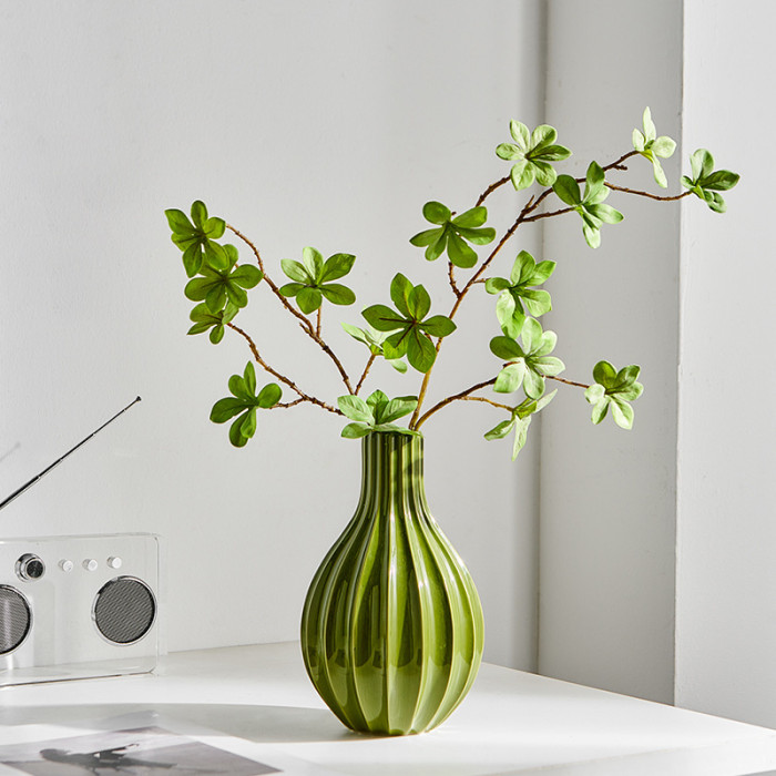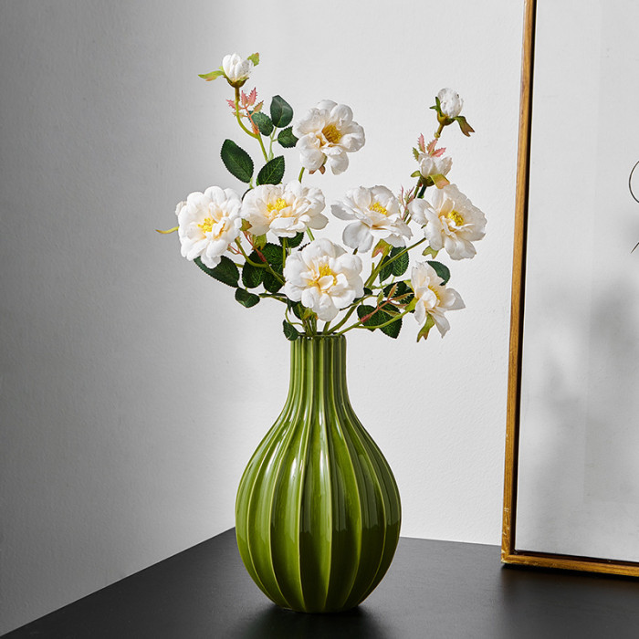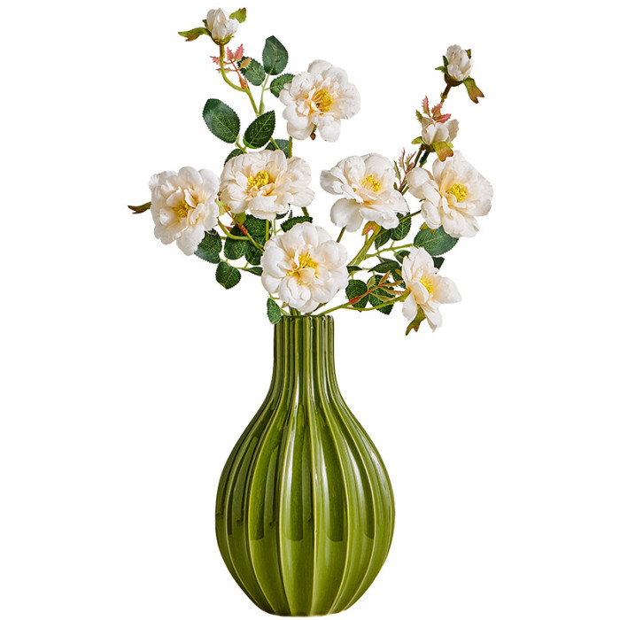 陶瓷綠色簡約條紋花瓶+倣真花