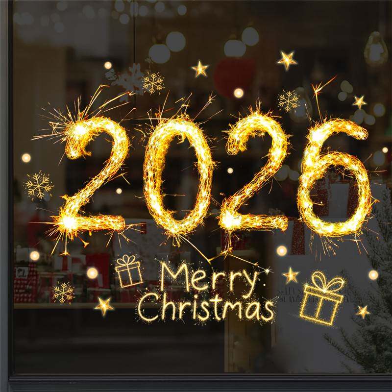 愛客JD4652聖誕節2026金色菸花傚果櫥窗貼紙 商店玻璃裝飾靜電貼