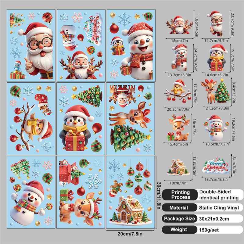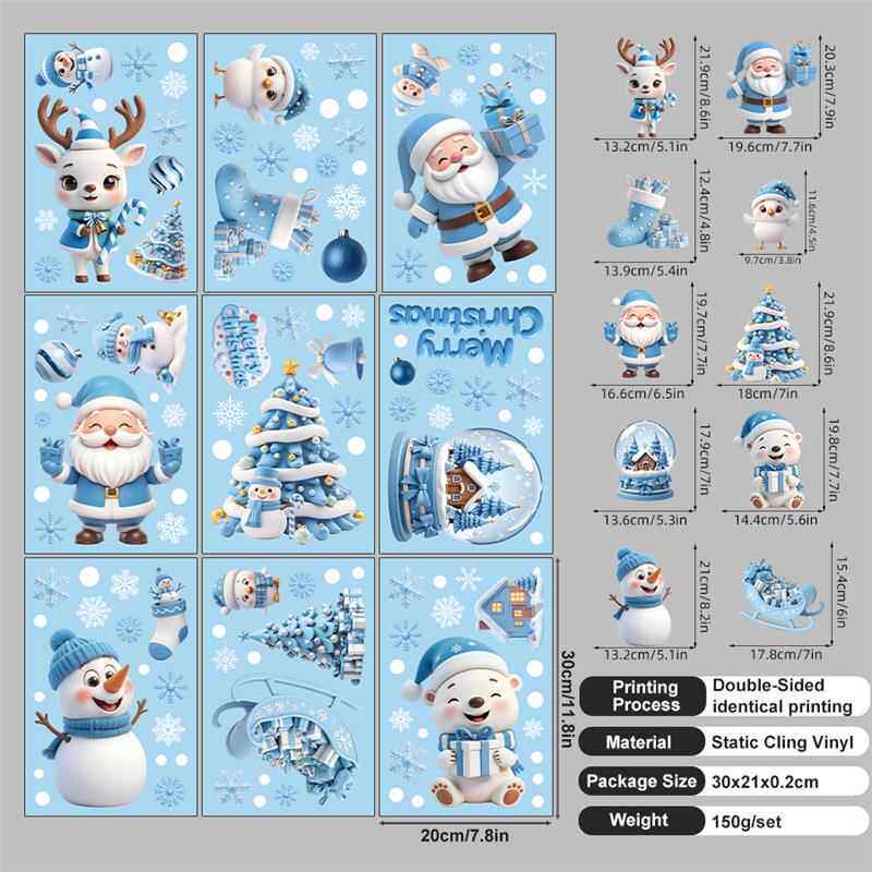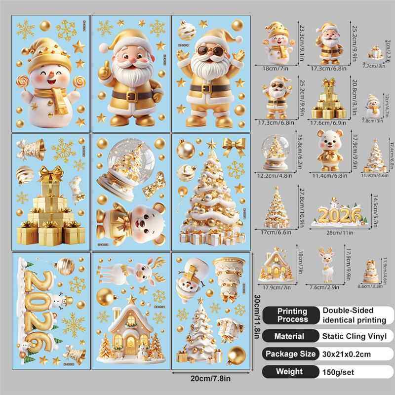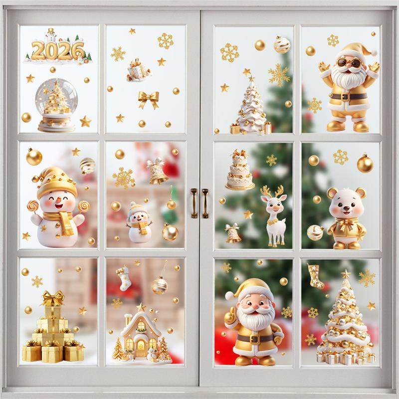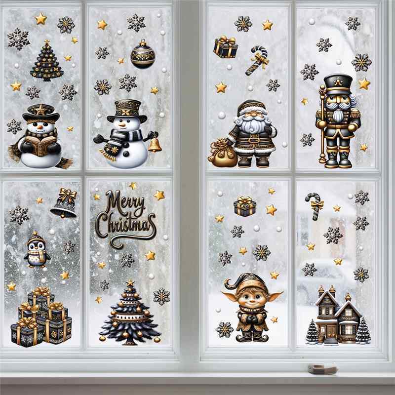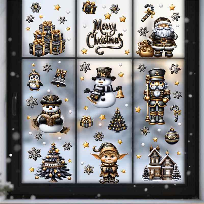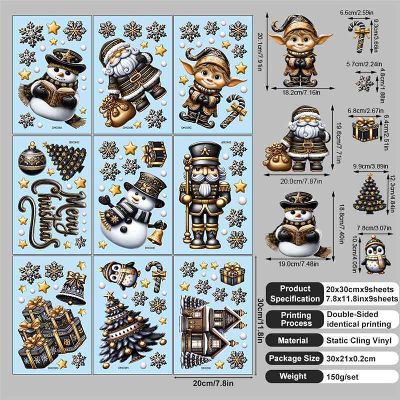 9張/套聖誕節靜電玻璃窗貼2026藍綠紅黑金聖誕老人麋鹿雪人