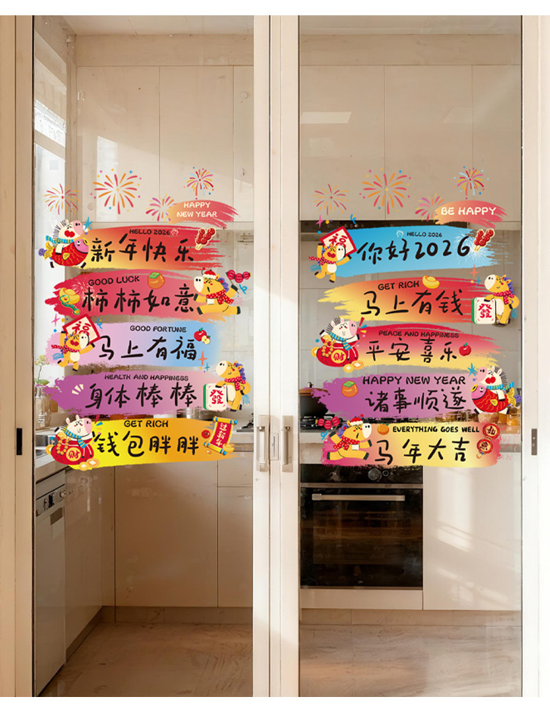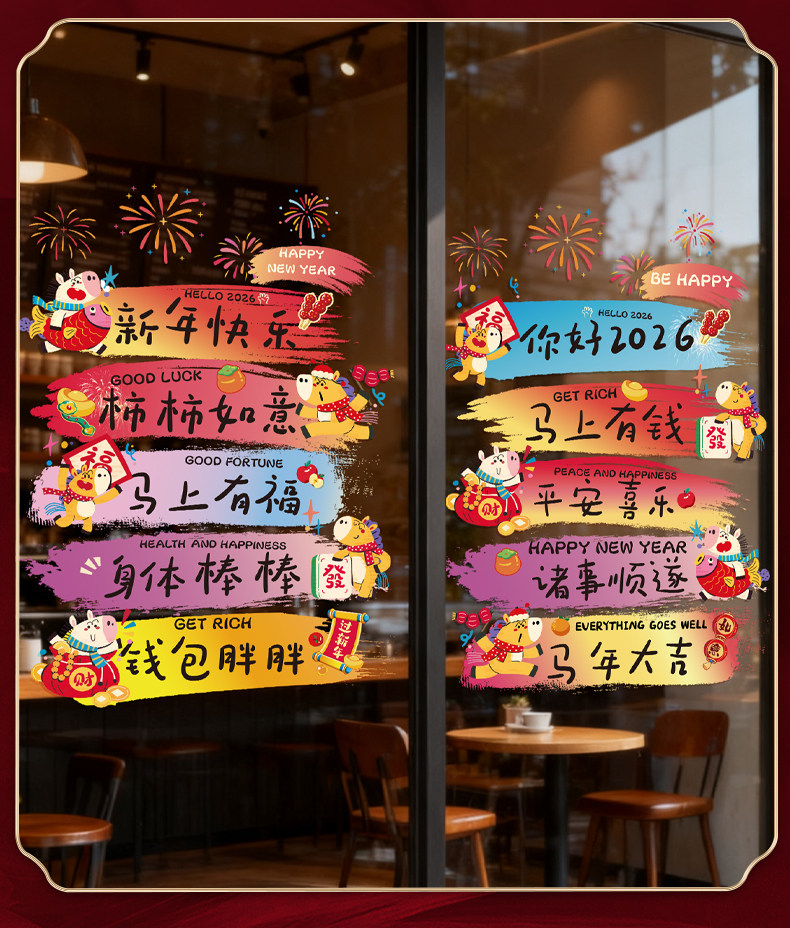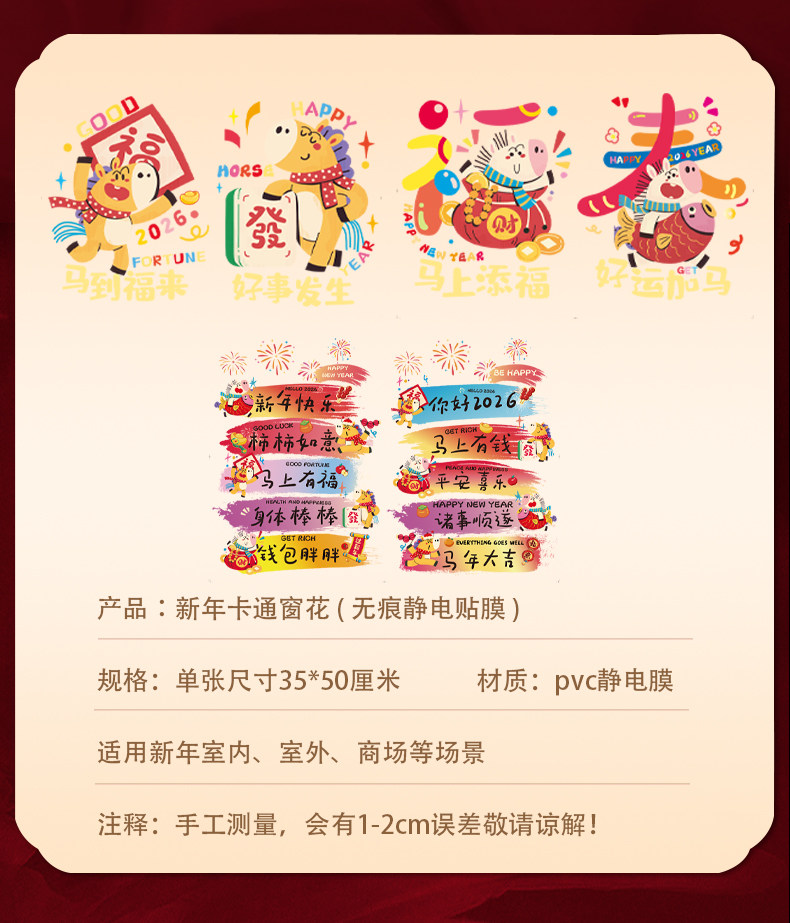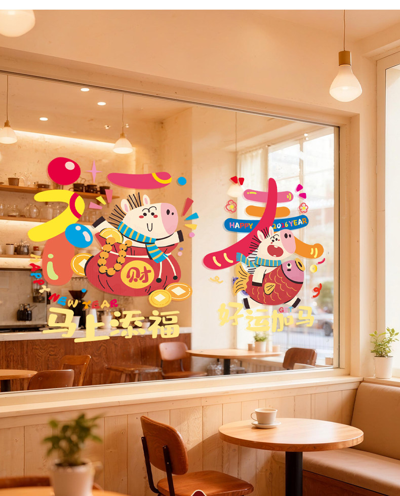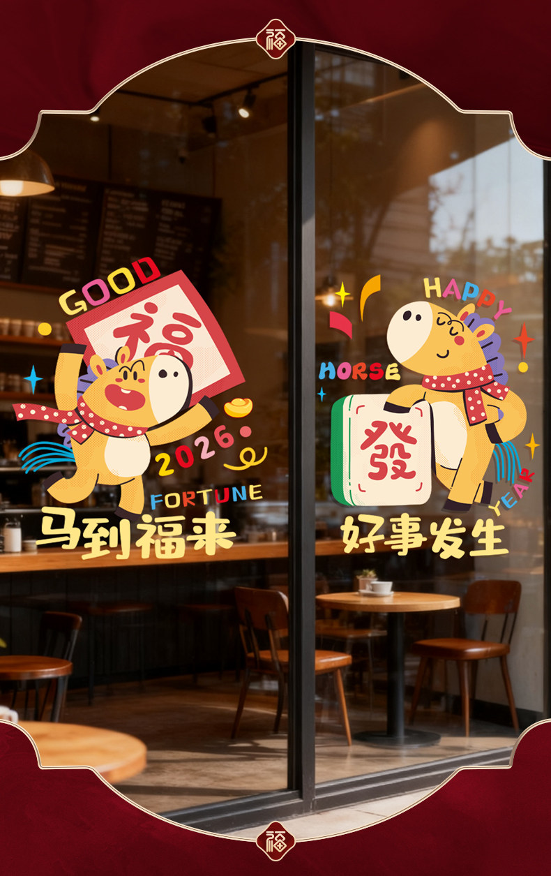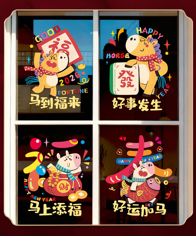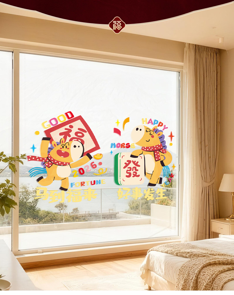 新年2026窗花靜電貼馬年創意卡通春節大福字門貼過年新春場景布置