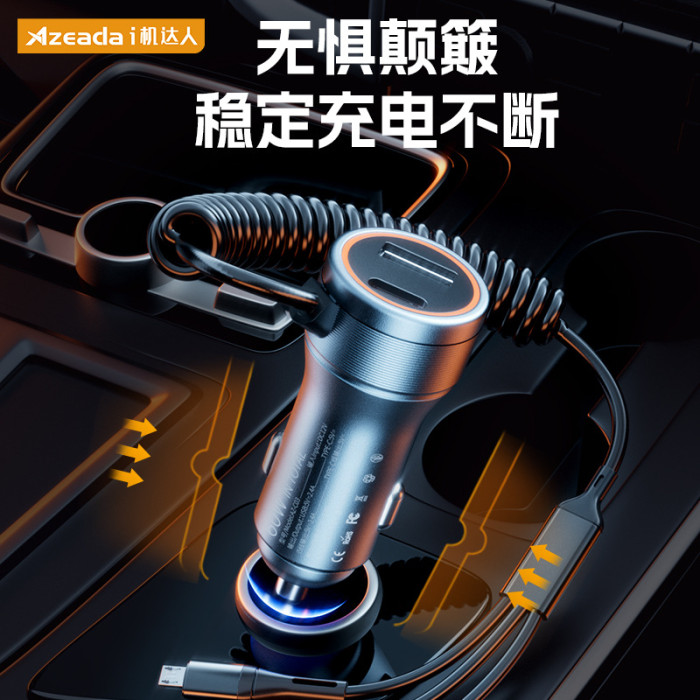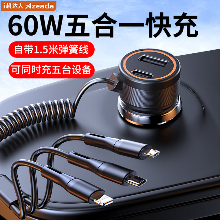 Azeada 車用充電器60W帶線車用快充充電頭一拖三蘋果15數據線車充