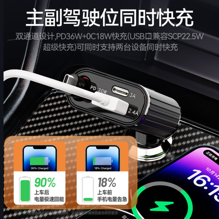自帶伸縮線多功能數顯汽車車用充電器矽膠PD30W快充手機充電器