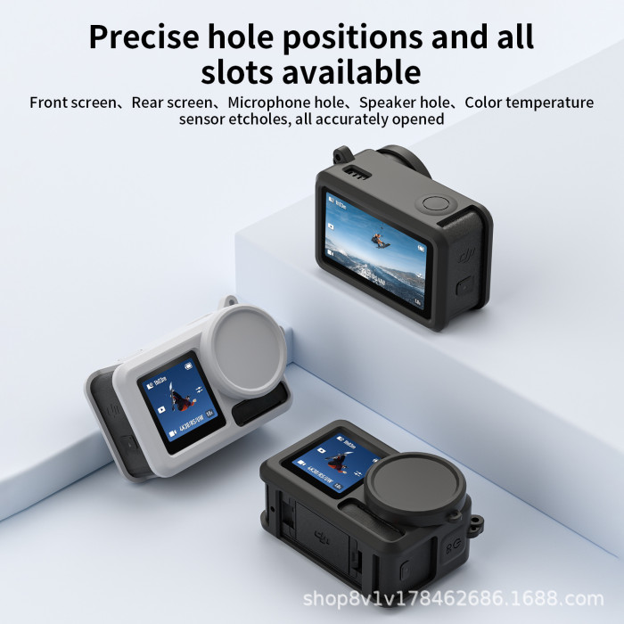 套裝一:Action5 Pro矽膠套+鏡頭蓋+一套裝鋼化膜+彩盒  (尺寸:6*4*8.2cm,重量:34g)