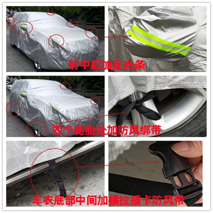 210T滌塔夫布料,材料已經做了防水工藝,水壓2000,4個輪胎有防風繩,車衣中間底部有橫拉方法繩釦,車衣前中後一共有6條反光條,配帶收納袋。歡迎新老客戶光臨。
