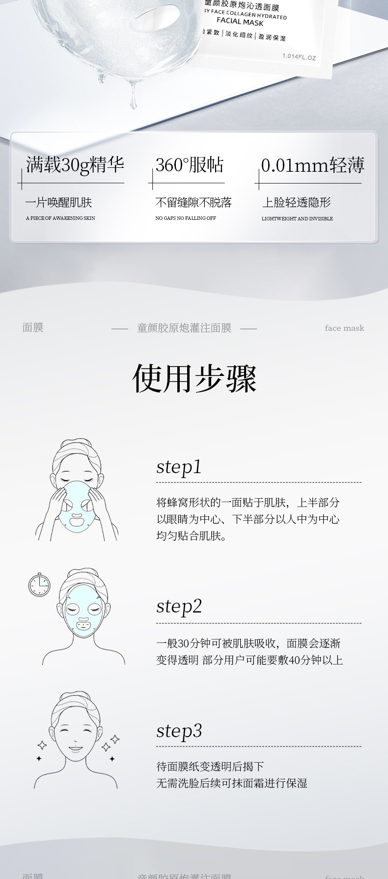 | 産品規格 | 童顔膠原砲灌注面膜 |