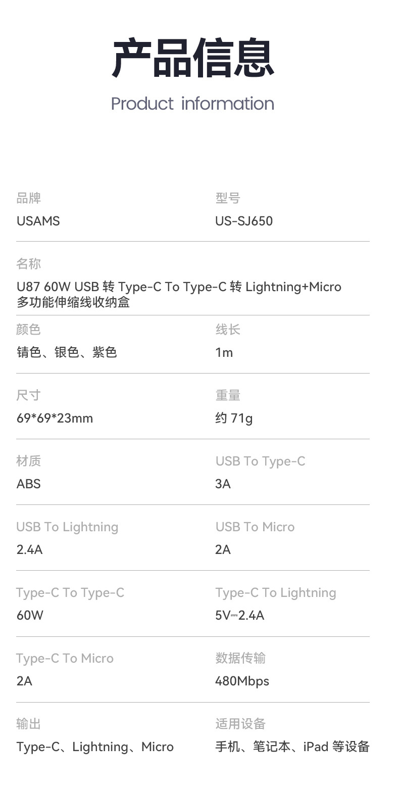 | 顔色 | US-SJ650 U87 60W數據線收納盒 |