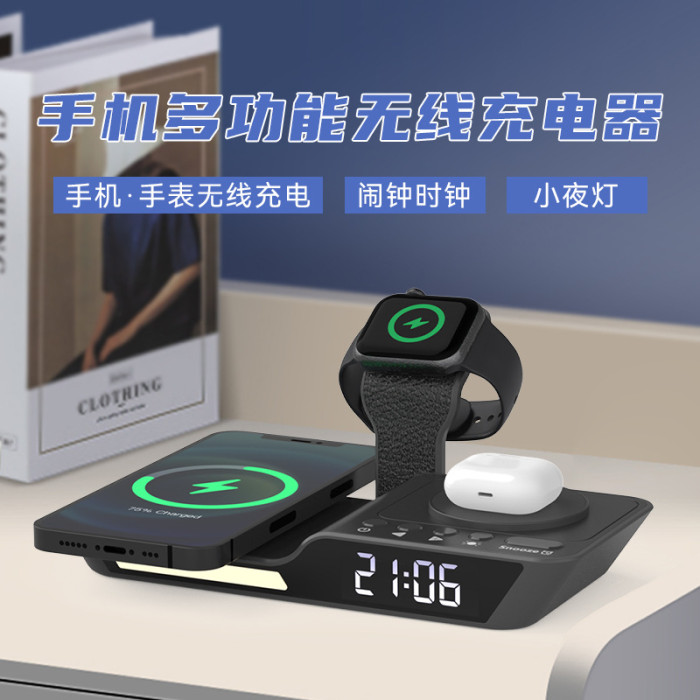 新款三合一無線充手機支架閙鍾小夜燈多功能無線充電器通用