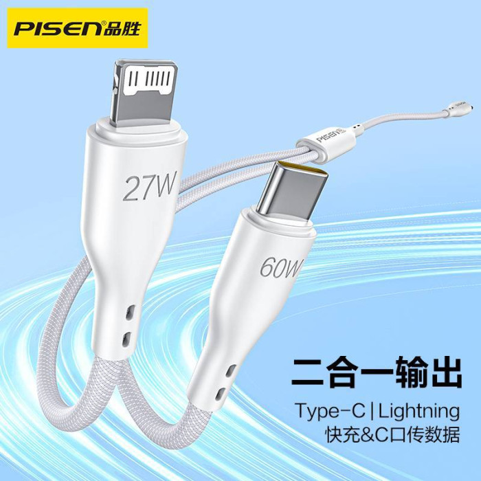 品勝二合一快充數據線適用蘋果16手機華爲一拖二C口PD平板充電線