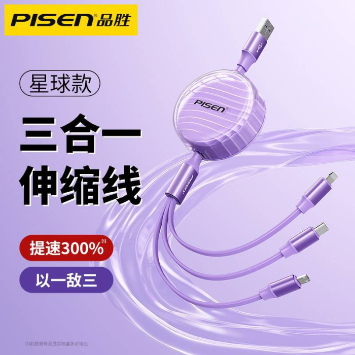 品勝一拖三充電線適用蘋果華爲安卓Tpc手機數據線三合一伸縮線