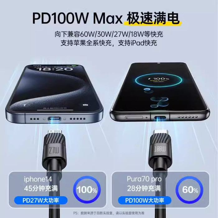 品勝適用蘋果16/15數據線一拖二100W快充二合一iPhone14充電線PD