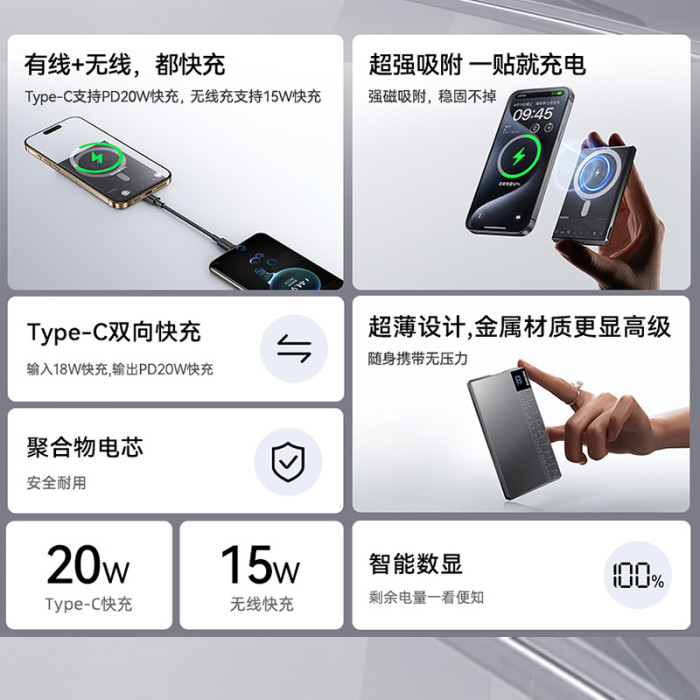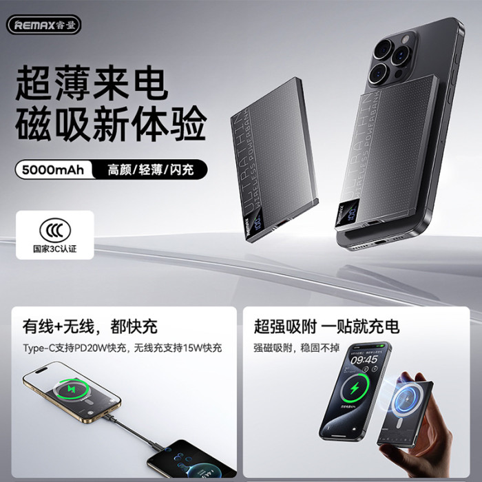remax超薄金屬磁吸無線充電寶帶線PD20W快充10000安培行動電源