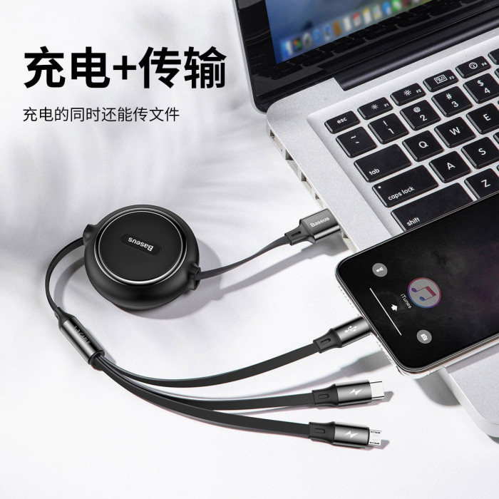倍思金環一拖三數據線充電線自由伸縮迷你可攜式多頭快充車用禮品