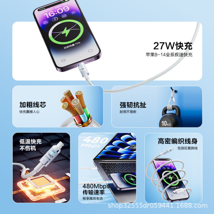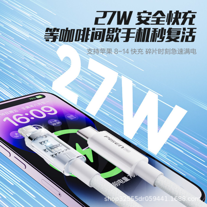 品勝數據線PD27W快充編織帶燈適用蘋果iPhone8/11pro/12/13promax