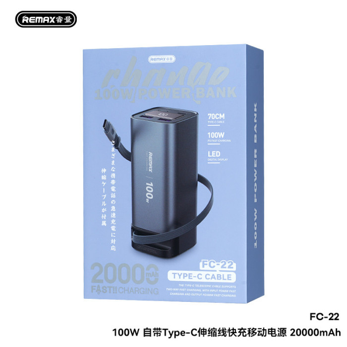 Remax自帶線100W快充充電寶20000安培大容量伸縮線行動電源3C認証