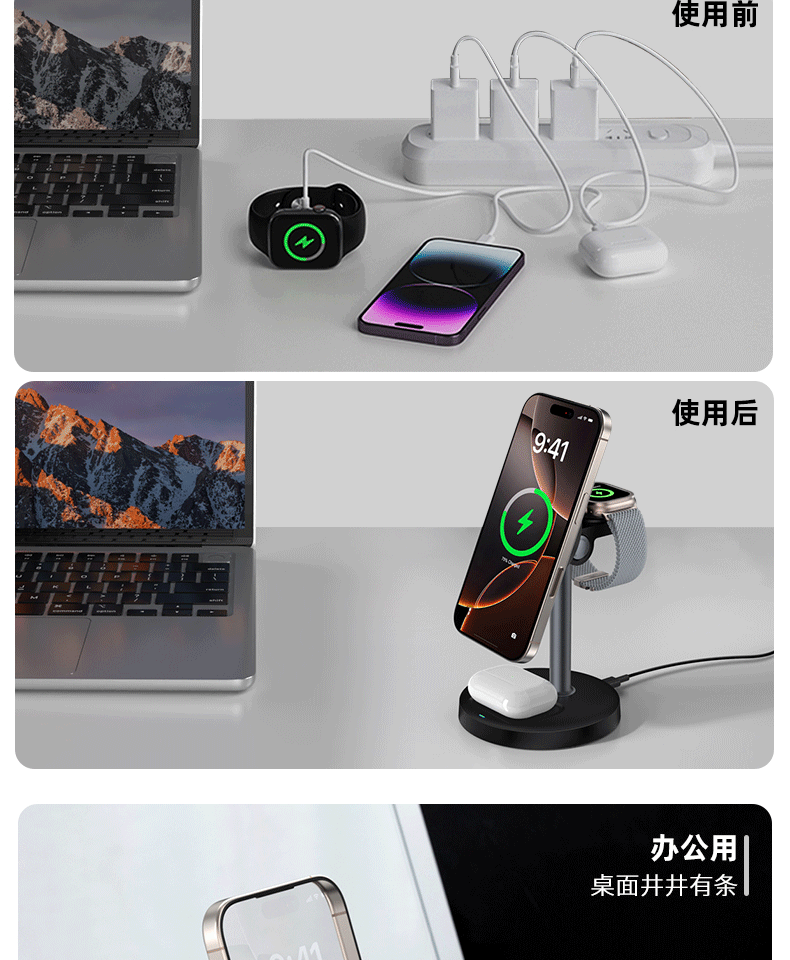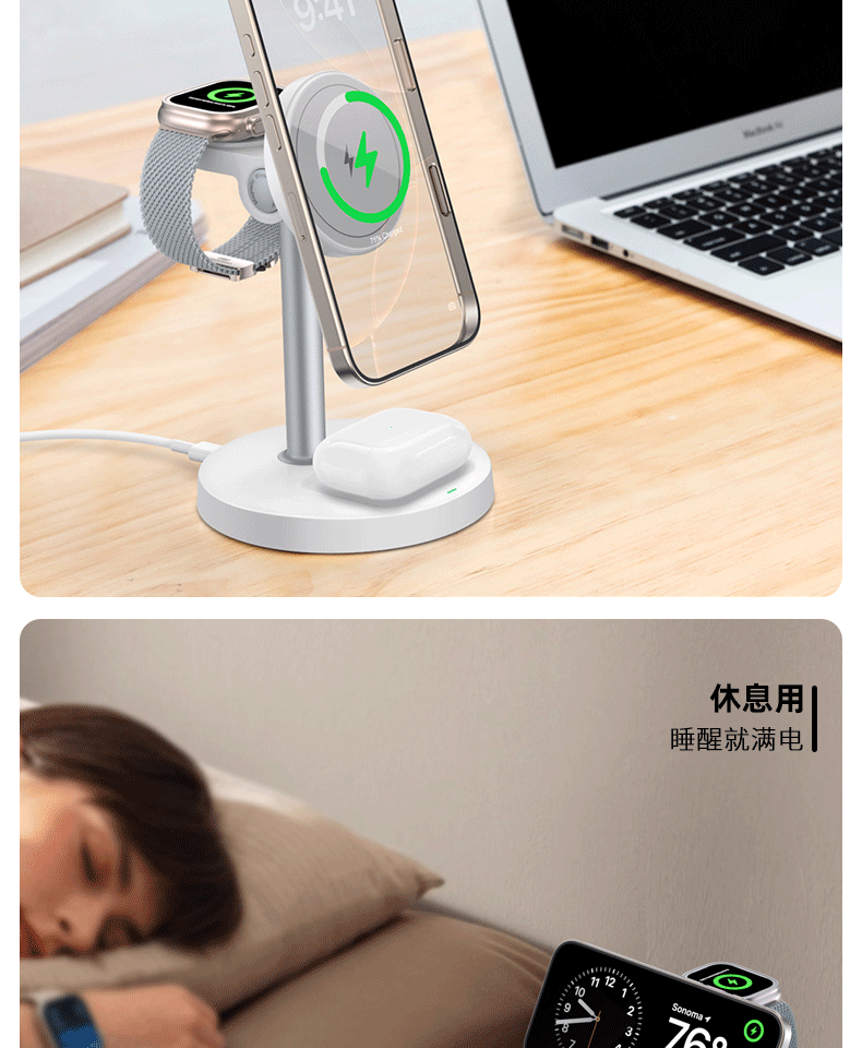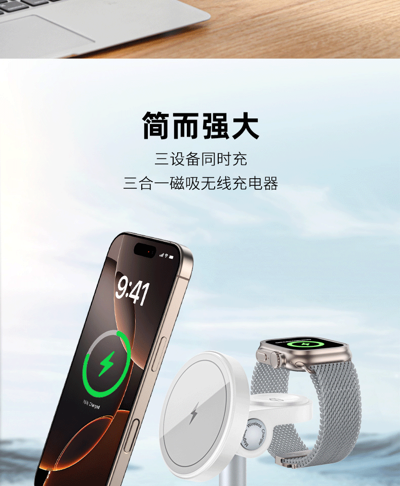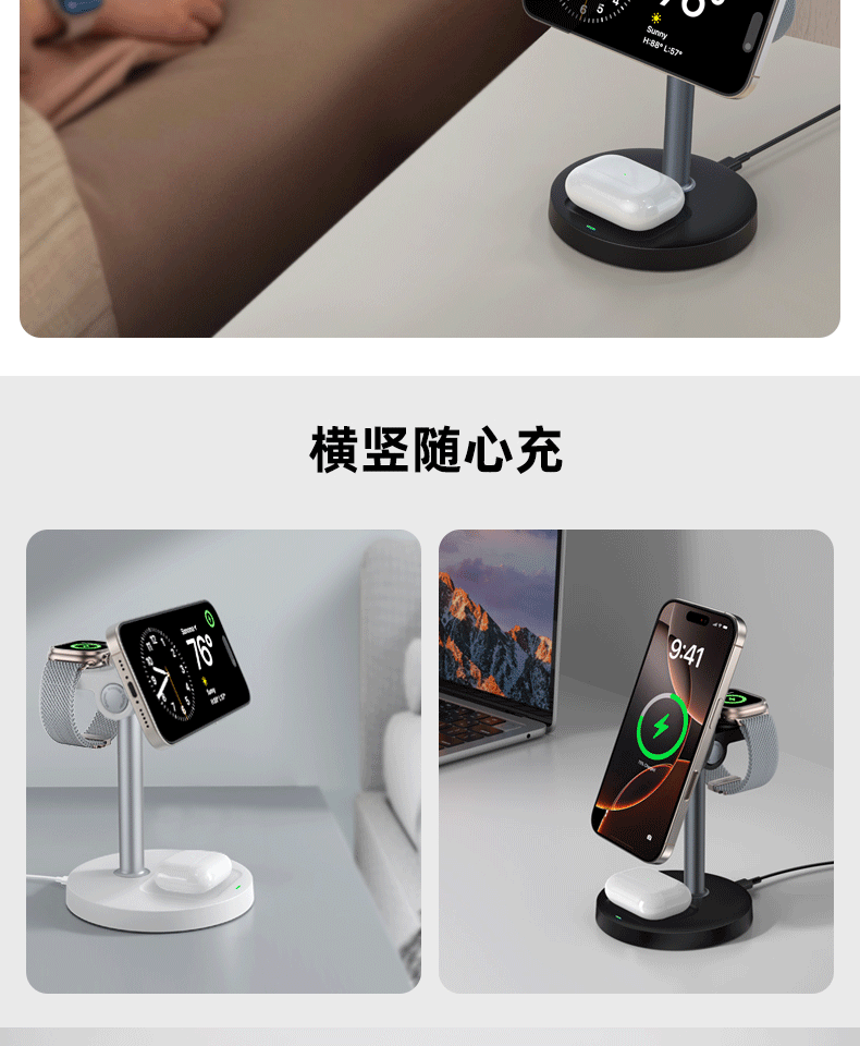 新款桌面磁吸無線快充帶支架三合一無線充適用於蘋果安卓華爲手機