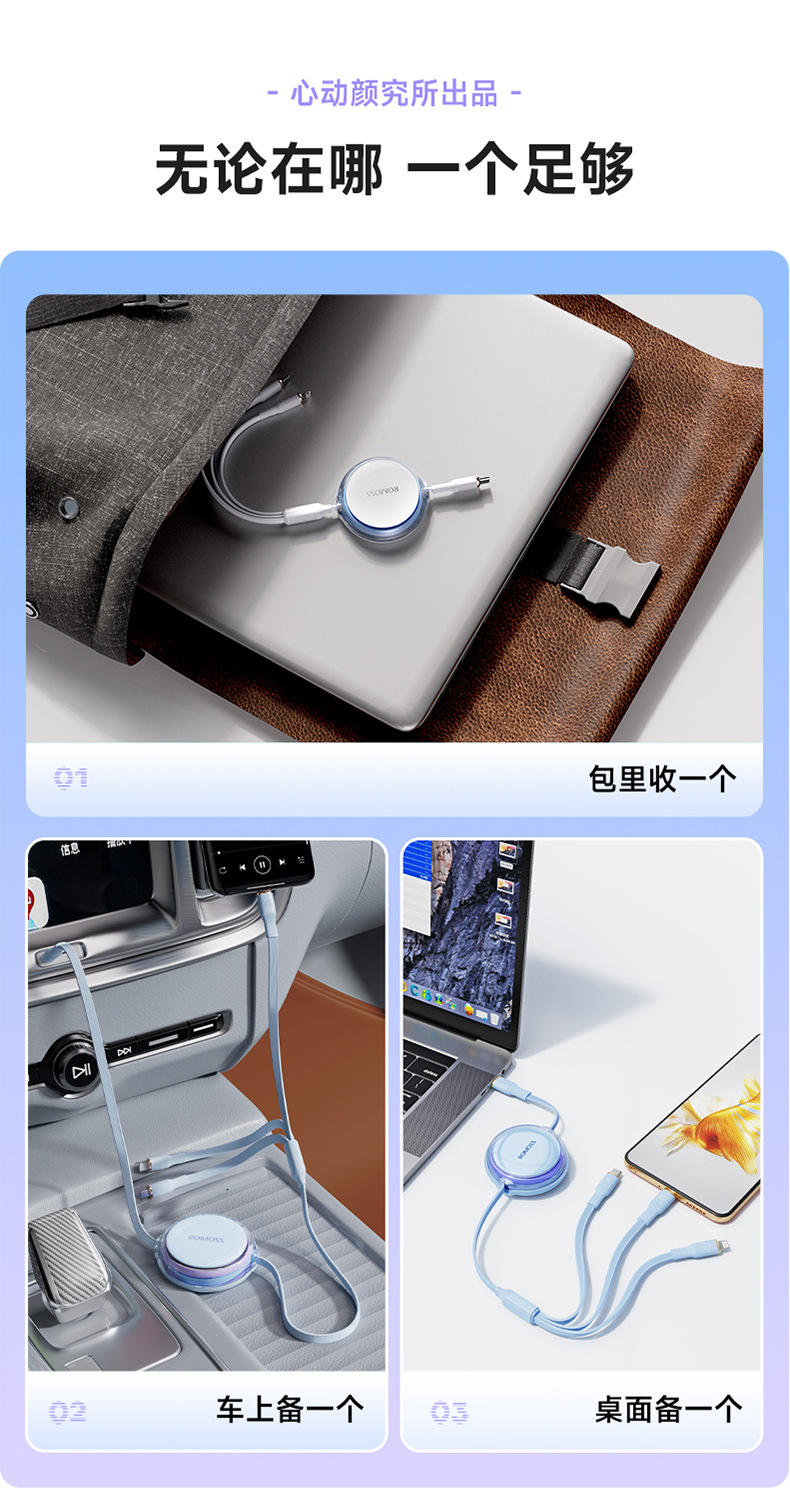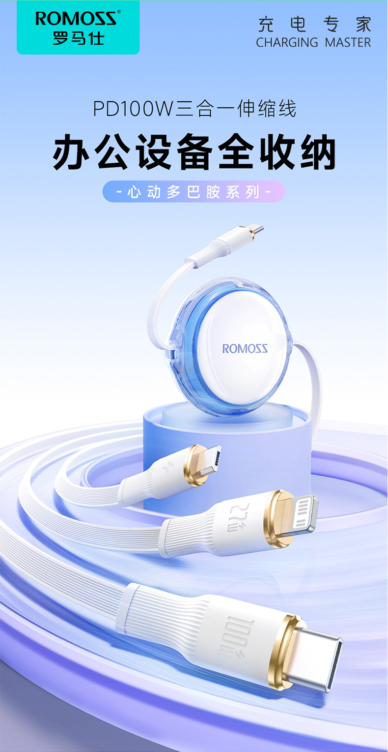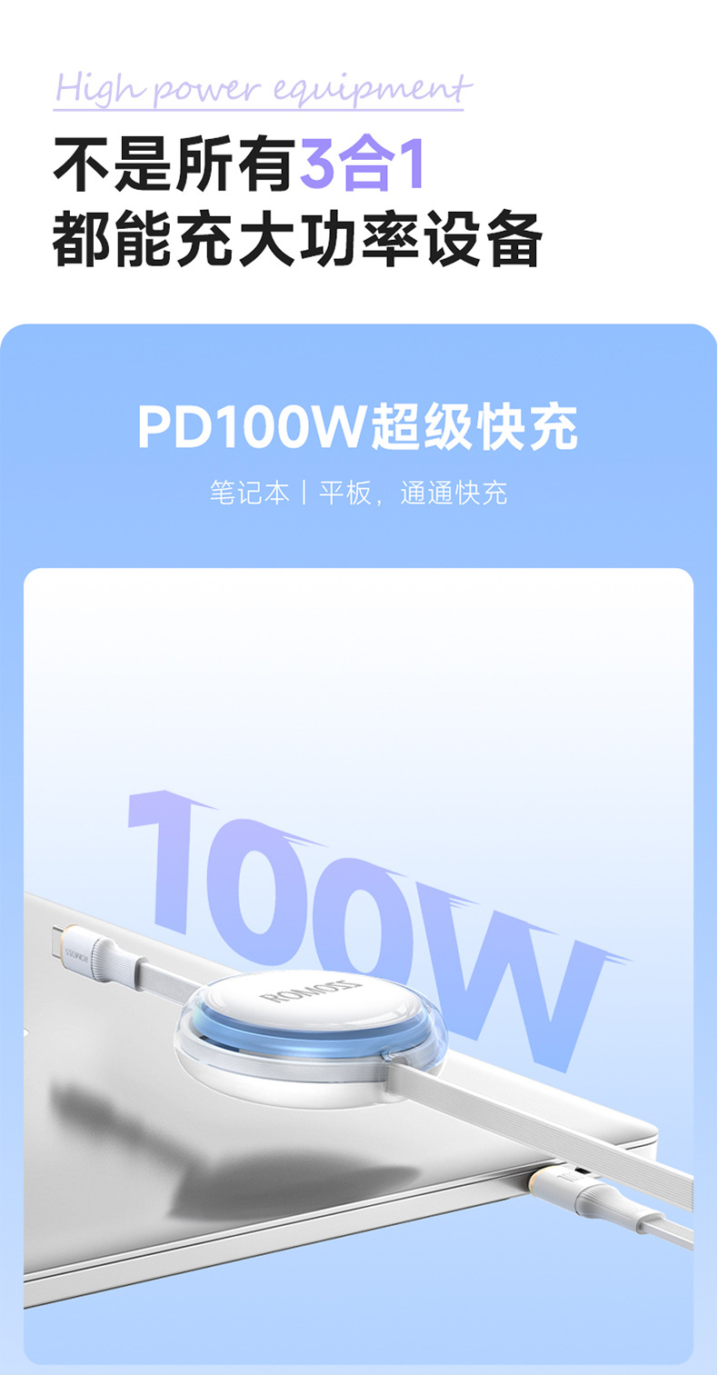 羅馬仕一拖三充電線PD100W適用蘋果華爲筆電數據線三合一快充線