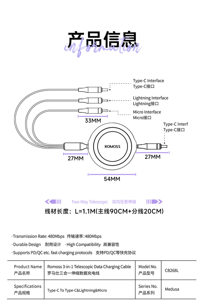 品名 羅馬仕一拖三數據線