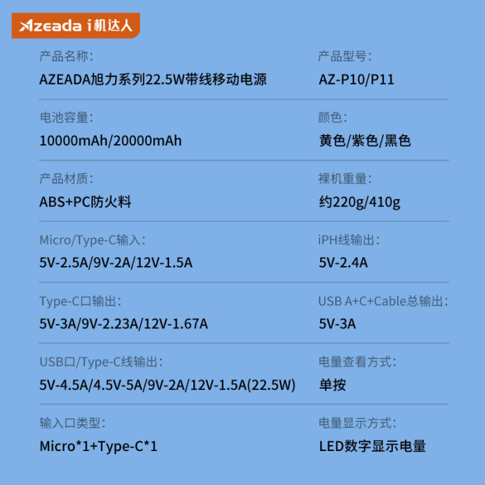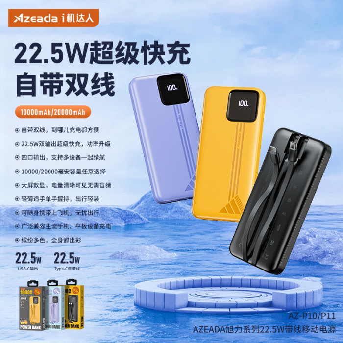 AZEADA 行動電源22.5w充電寶2w安培自帶線快充超薄可攜式禮品