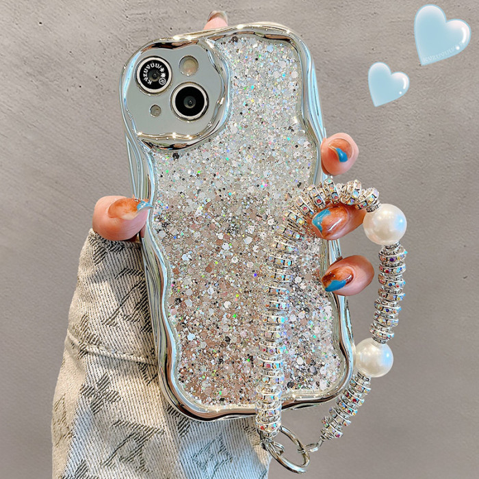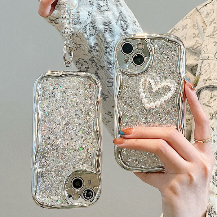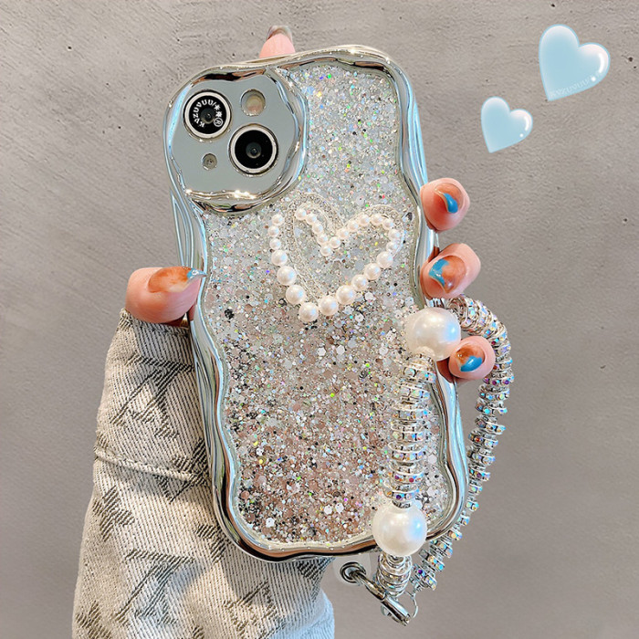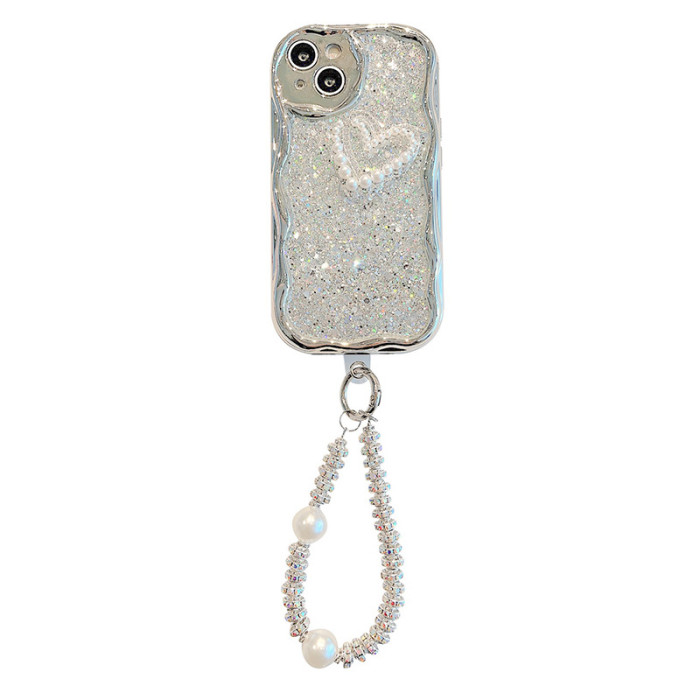 波浪紋電鍍手機殼適用iPhone16promax手提鏈條愛心珍珠蘋果15女款